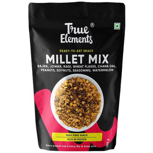 True Elements Millet Mix is a super snack that you can enjoy when you crave something spicy but healthy. This Millet Mix is made of wheat flakes, and millets such as Ragi, Jowar, Bajra, Chana Dal, Watermelon seeds, Soynuts and tasty Indian spices. It is rich in protein and fibre with 12g/100g each. It’s a perfect snack if you are craving something savoury, mouthwateringly delicious but most importantly, healthy! We are 100% wholegrain, rich in proteins, and made of 100% natural ingredients, no false promises or claims. This Millet Mix is the best way to start your day on a healthy note or end your day fulfilling your nutritional needs. It is easy to digest and also helps in weight loss due to the presence of dietary fibre. When mixed with Dahi or buttermilk, this healthy Millet Mix can become one of the most delicious treats for your Indian cravings. It is a wonderful mid-day hunger snack that you can also just consume plain or pair with your favourite beverage.