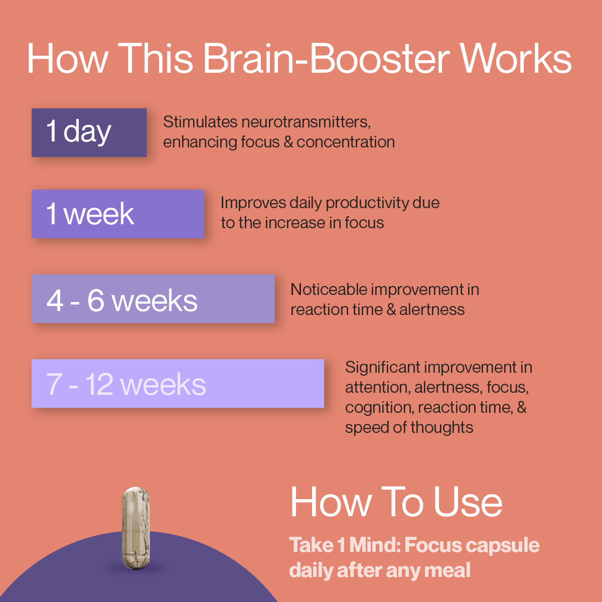 Backed by Science Guaranteed! Only contains high-quality and clinically validated ingredients. Contains four powerful actives - Brahmi, Ginkgo biloba and L-Theanine. These actives have been carefully selected to help boost cognitive function. 1, Recommended Usage: One capsule a day after meals, or as recommended by a health specialist. Do not exceed the recommended serving dose. Supports overall brain health, Boosts cognitive function and productivity.