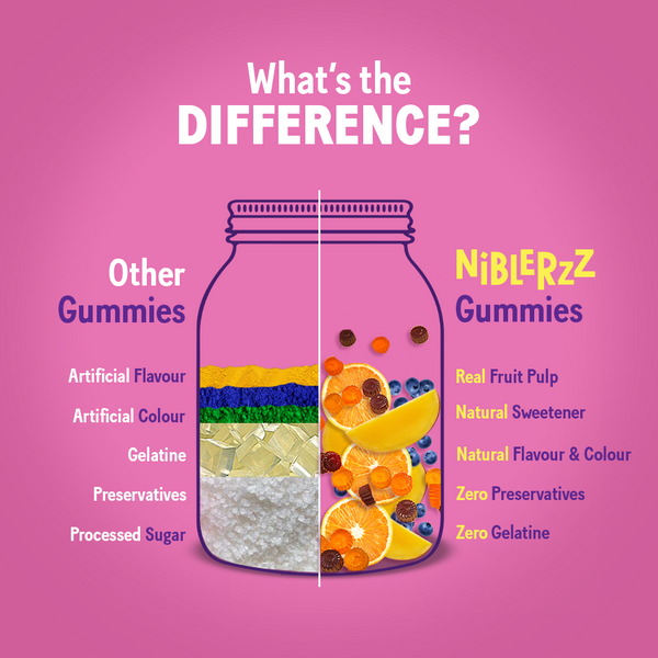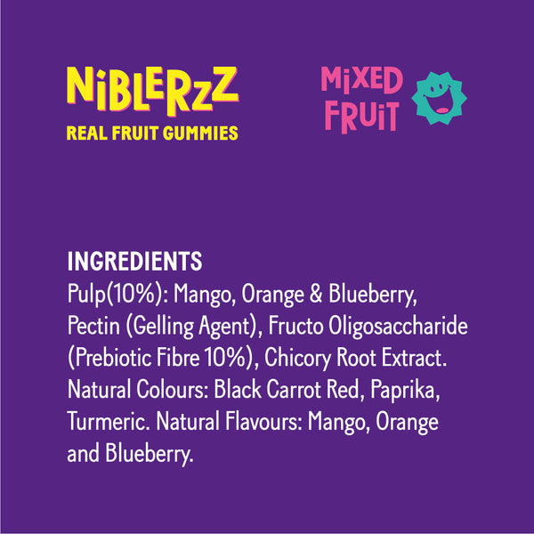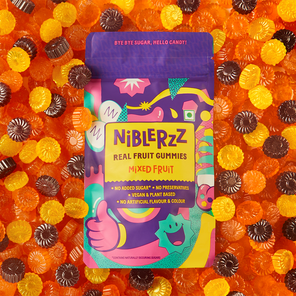 Bye Bye Sugar, Hello Candy! Real fruit gummies with no added sugar, no preservatives, no artificial colour & flavour, vegan & plant based. A 30gm pack Orange flavour. Now you can #nibleguiltfree