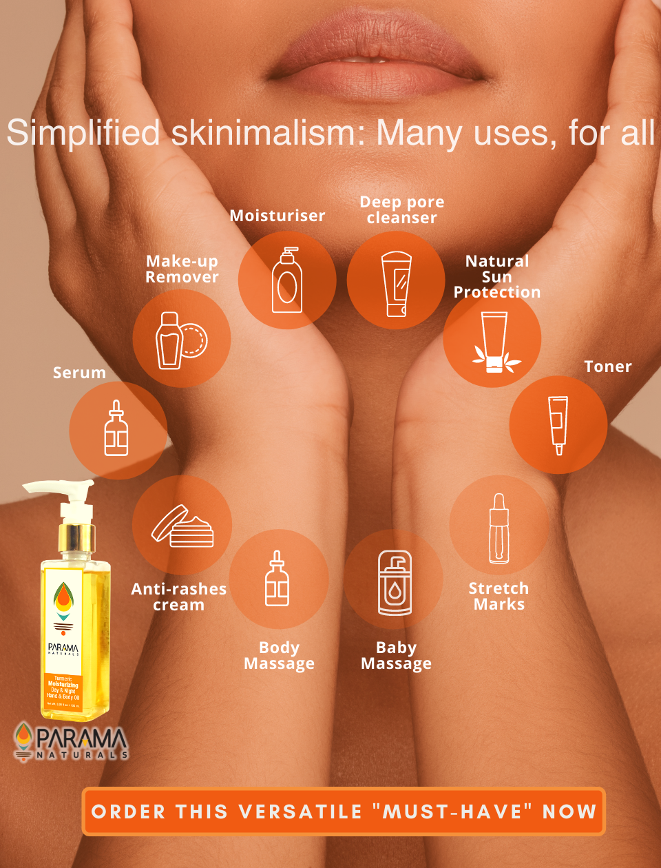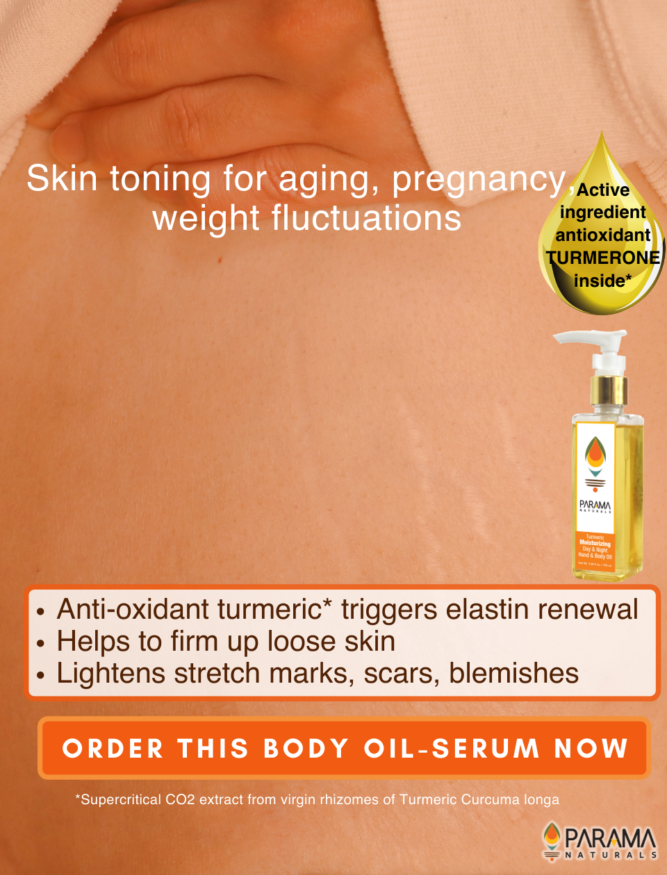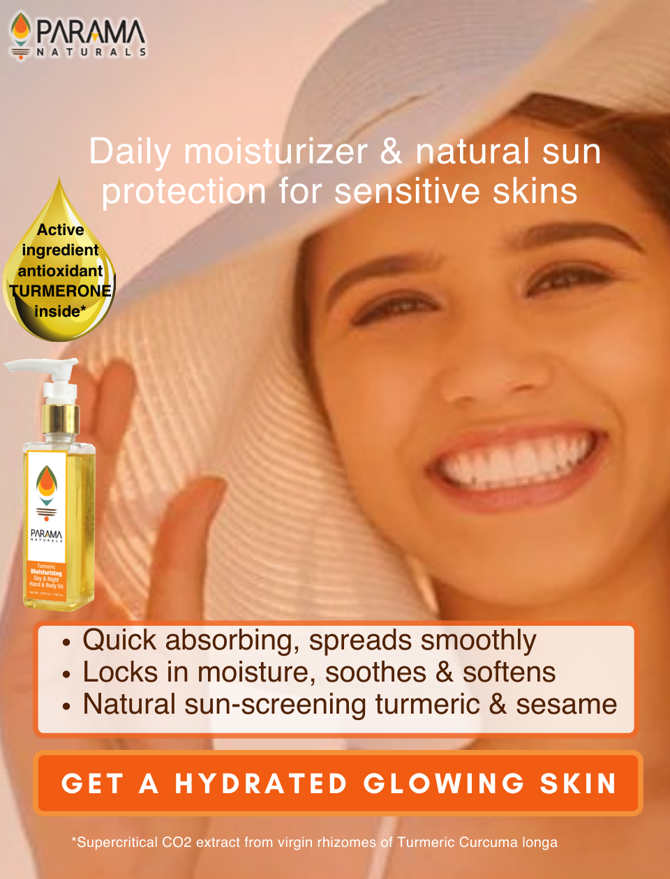 This product is quick-absorbing, non-sticky, long-lasting hydration with 100% natural skin toning, soothing and sun protection properties of turmeric and sesame oil, for acne-prone, sensitive, all skin types. It is a post-bath moisturising oil for soft, smooth and supple skin. With anti-oxidant-rich turmeric and virgin cold-pressed oils of almond, coconut and sesame. This all-in-one skincare solution, with multiple benefits of moisturiser, serum, toner, deep pore cleanser, anti-rash ointment and stretch-mark cream. is applied on preferably on moist skin. With cosmetic, protective, healing, soothing, anti-inflammatory, anti-bacterial, anti-fungal properties, anti-anxiety, soothing, detoxifying, deep cleansing, sun-screening and skin-clarifying properties of turmeric combined with vitamins (A, E, D), minerals and elastin-repairing fatty acids gives you a smooth and even skin tone. It addresses acne, blackheads, blemishes, scars, itching, infections while the ingredients collectively address deep-penetrating issues like scars, keloids, fine lines, wrinkles, pigmentation, sunburn, itchy skin, rashes, uneven skin tone, stretch marks, rough skin, cracked heels. This non-comedogenic, balanced formulation is non-greasy, quick-absorbing, stain-free, easy to use and suitable for all-day use.