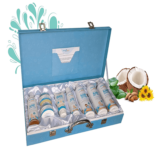 Here's what the kit contains: Baby Body Wash (250ml), Tear-free Baby Shampoo (250ml), Baby Lotion (250ml), Baby Massage Oil (120ml), Baby Face Cream (50gm), Baby Bottom Wash (140ml), Baby Bum Butter (50gm), Diaper Rash Cream (50gm), Suitcase Gift Box