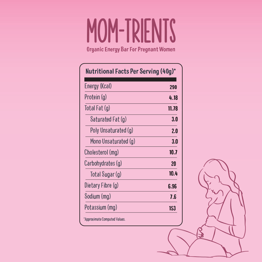 Mom-trients Energy Bar for Pregnant Women is a premium nutrition product offering to help them with balanced and multi-source nutrition. Made from diligently selected organic ingredients rich in antioxidants and wellness properties, MOM-TRIENT Energy Bar for Pregnant Women is an advanced phytonutrient formula to nourish both the mother and the baby in the womb. Rich phytochemical content in MOM-TRIENT Energy Bars help in managing prenatal issues (cravings, nausea, hormonal changes, mood swings, morning sickness, etc.). Highly bioavailable MOM-TRIENT Energy Bars will meet the additional nutrition requirement during the pregnancy. MOM-TRIENT Energy Bar is the 'super-natural' snack for added energy during pregnancy!!
