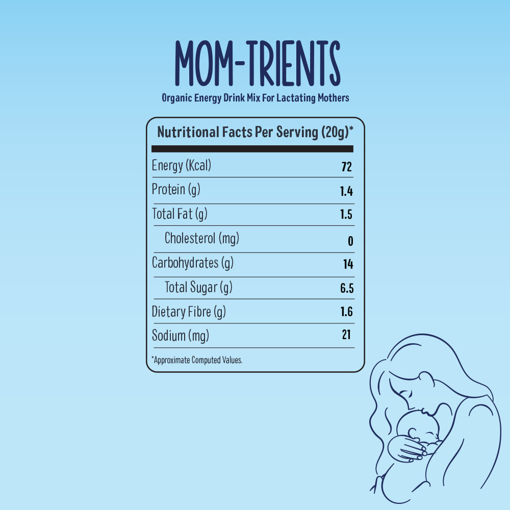 Mom-trients Energy Drink for Lactating Mothers is a premium nutrition product to help recover from childbirth and support breastfeeding. Made from diligently selected 100% certified organic ingredients that are rich in antioxidants and wellness properties. The energy drink for Lactating Mothers is an advanced phytonutrient formula to nourish both the mother and baby. Rich phytochemical content helps recover from postpartum(soreness, afterpains, incontinence, haemorrhoids, hormonal changes, weight gain, etc.). Highly bioavailable balanced nutrition helps promote increased lactation in mothers.
