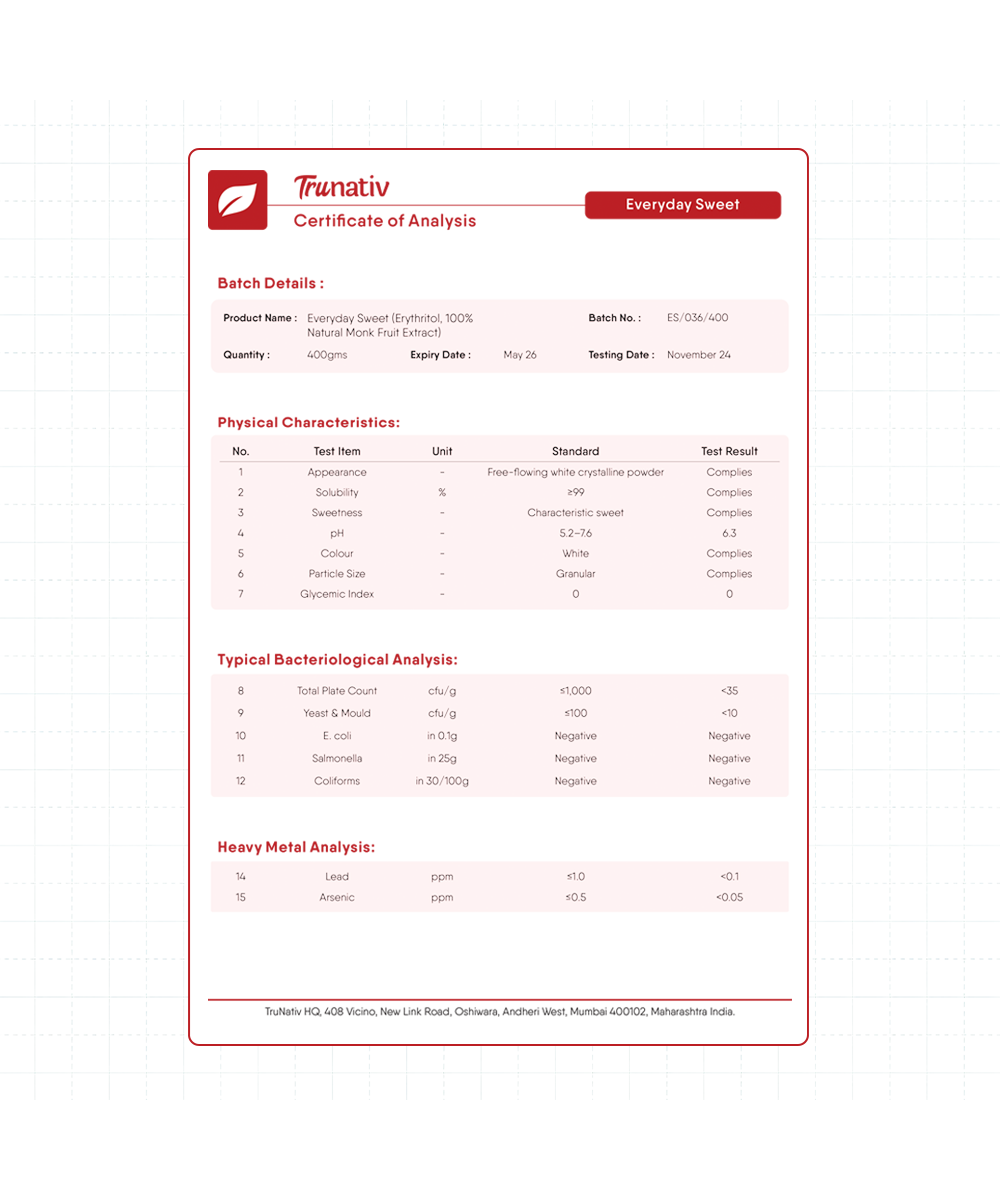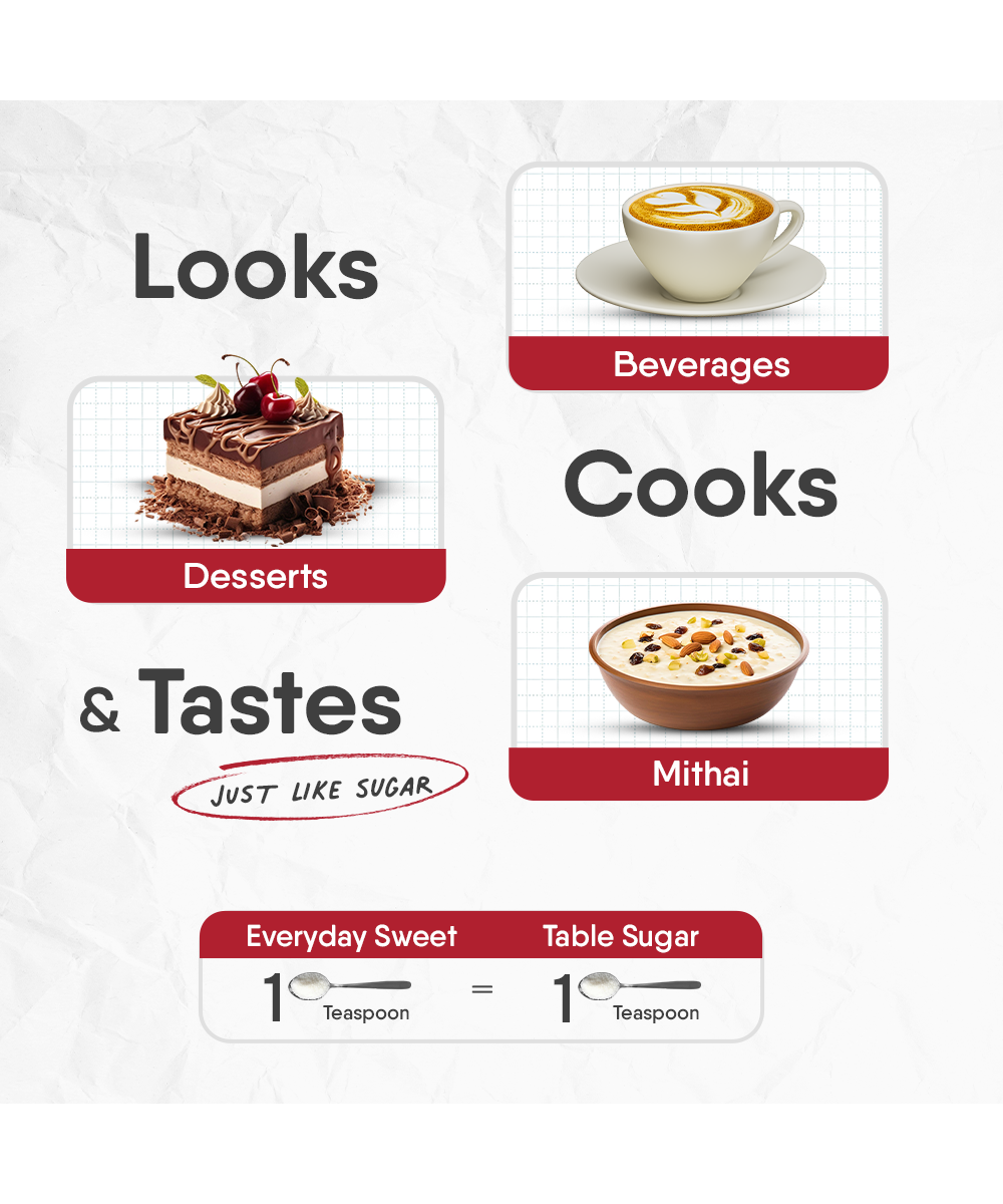 Everyday Sweet is a 100% natural sweetener made from a blend of monk fruit extract and NON-GMO erythritol. Free from artificial flavorings and sweeteners, it provides a healthier alternative to sugar, offering sweetness without the harmful effects of fructose and glucose. The monk fruit extract in Everyday Sweet contains mogrosides, powerful antioxidants that give it a delicious, natural sweetness.