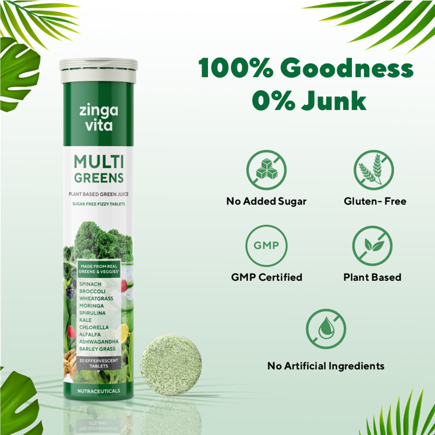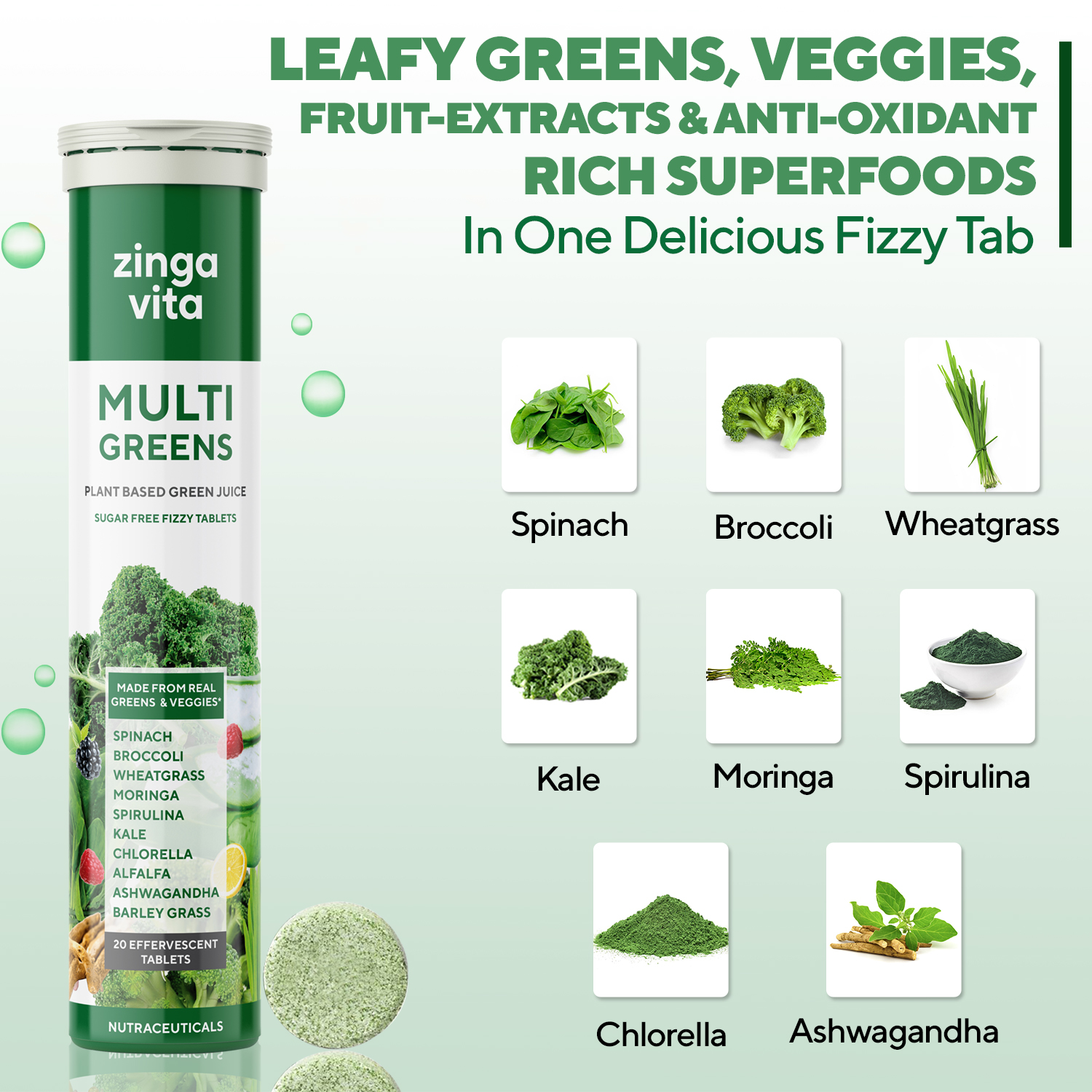 Leafy Greens, Veggies And Superfoods In One Delicious Fizzy Tablet!Leafy Greens? Boring Veggies, Let'S Face It, Green, Leafy Vegetables Aren'T The Tastiest Lot, And How Much Of Them Can You Really Pack Into One Meal? Well, That'S What We'Re Here For. With Zingavita Multi Greens Sugar Free Effervescent Tablets Pack Fresh Organic Greens, Veggies, And Fruits Into One Deliciously Fizzy Tab And Make Things So Much Simpler With A Plethora Of Benefits To Keep You Healthy And Happy!