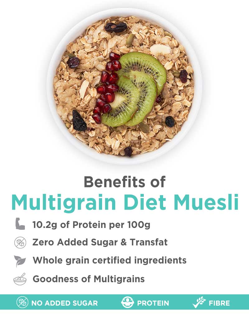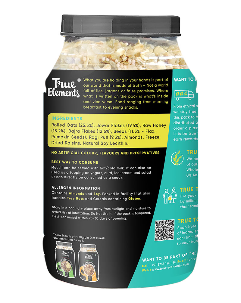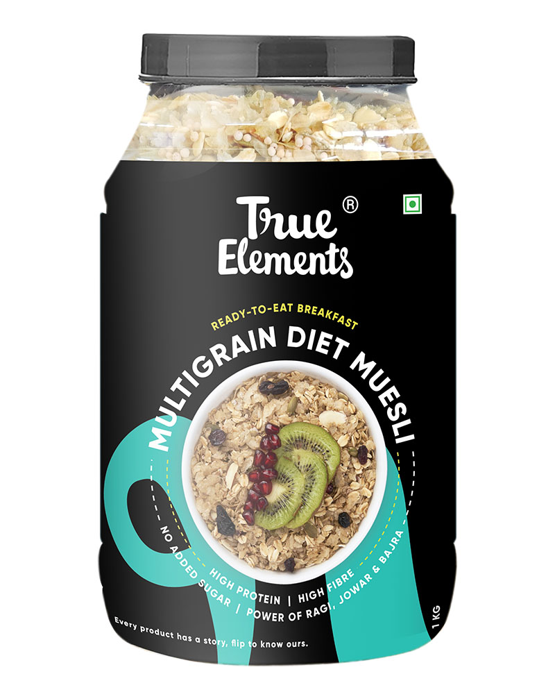 True Elements Multigrain Diet Muesli is composed of a mixture of wholesome multigrain, all of which are devoid of any added sugar, colors or preservatives.