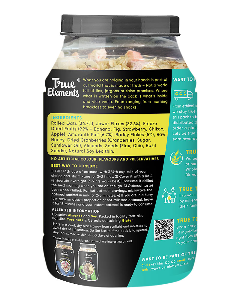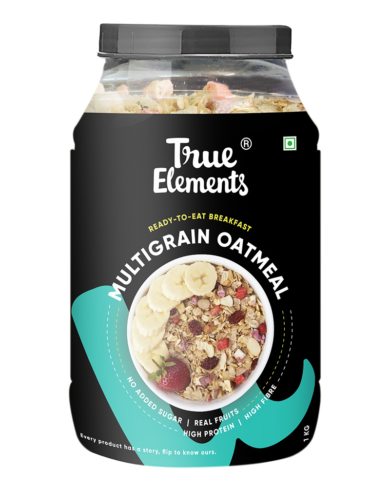 Hence, to make the best use of whole grains and its benefits, with a taste palatable to your taste buds, True Elements Multigrain Oatmeal has been curated. Chosen on the basis of taste, our multigrain oatmeal comprises of Bajra, Jowar, Barley in the form of flakes and Amaranth in the form of puff, for a crispy texture. It possesses the same composition of Honey and Cane Sorghum as compared to the ordinary oatmeal, with Zero Added Sugar. When soaked in milk, it changes to a slight brown colour, due to the presence of whole grains.