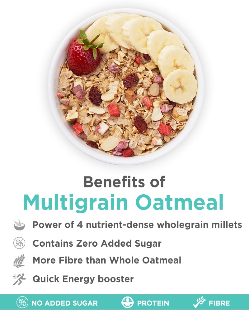 It is comparatively dense in nutrition such as Fibre & Complex Carbs than the ordinary whole oatmeal. Loaded with the goodness of real (freeze-dried) fruits and Chia & Basil seeds, it is one of the most nutrient-rich breakfast one can wake up to.