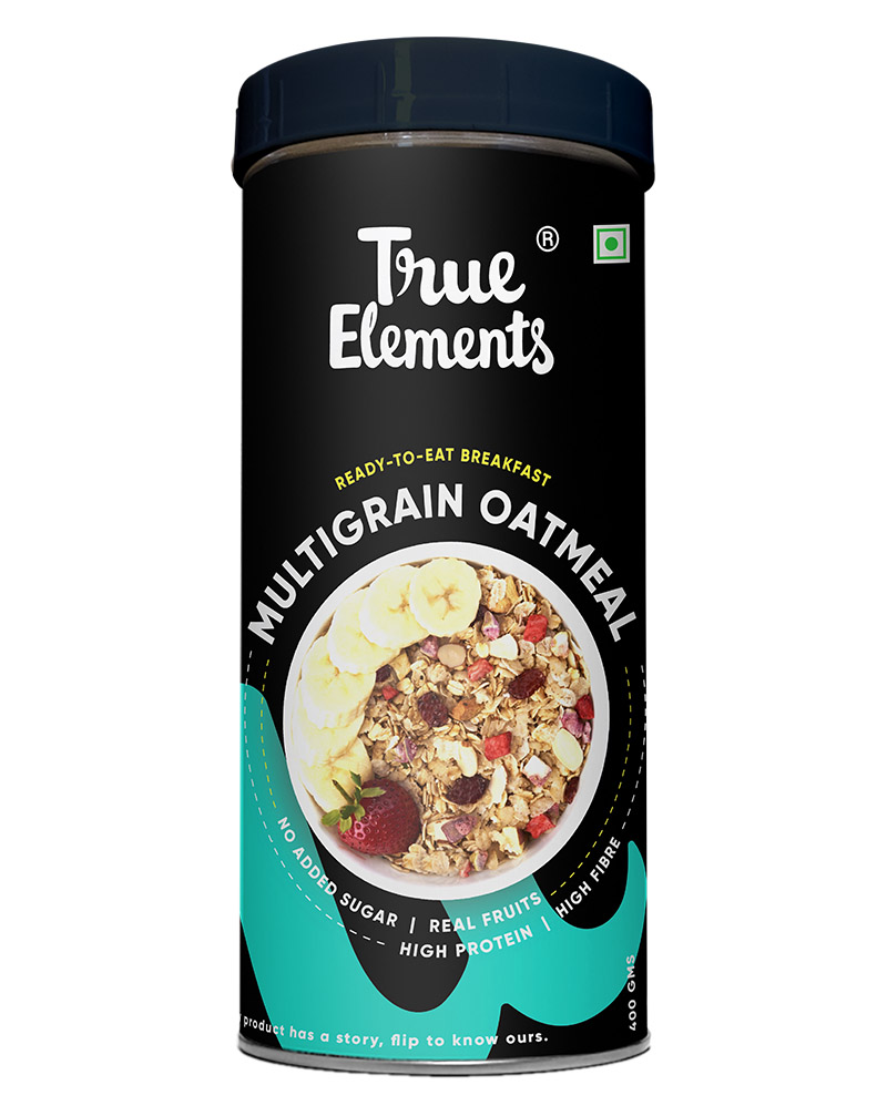 Hence, to make the best use of whole grains and its benefits, with a taste palatable to your taste buds, True Elements Multigrain Oatmeal has been curated. Chosen on the basis of taste, our multigrain oatmeal comprises of Bajra, Jowar, Barley in the form of flakes and Amaranth in the form of puff, for a crispy texture. It possesses the same composition of Honey and Cane Sorghum as compared to the ordinary oatmeal, with Zero Added Sugar. When soaked in milk, it changes to a slight brown colour, due to the presence of whole grains.