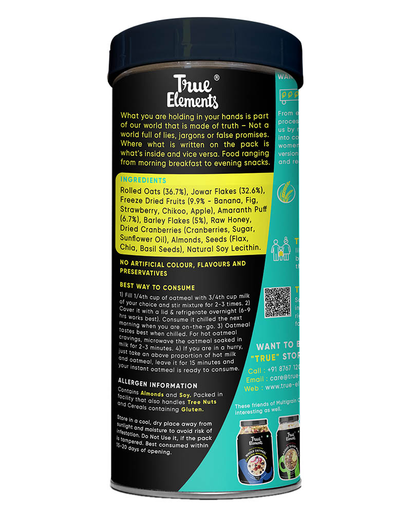 It is comparatively dense in nutrition such as Fibre & Complex Carbs than the ordinary whole oatmeal. Loaded with the goodness of real (freeze-dried) fruits and Chia & Basil seeds, it is one of the most nutrient-rich breakfast one can wake up to.