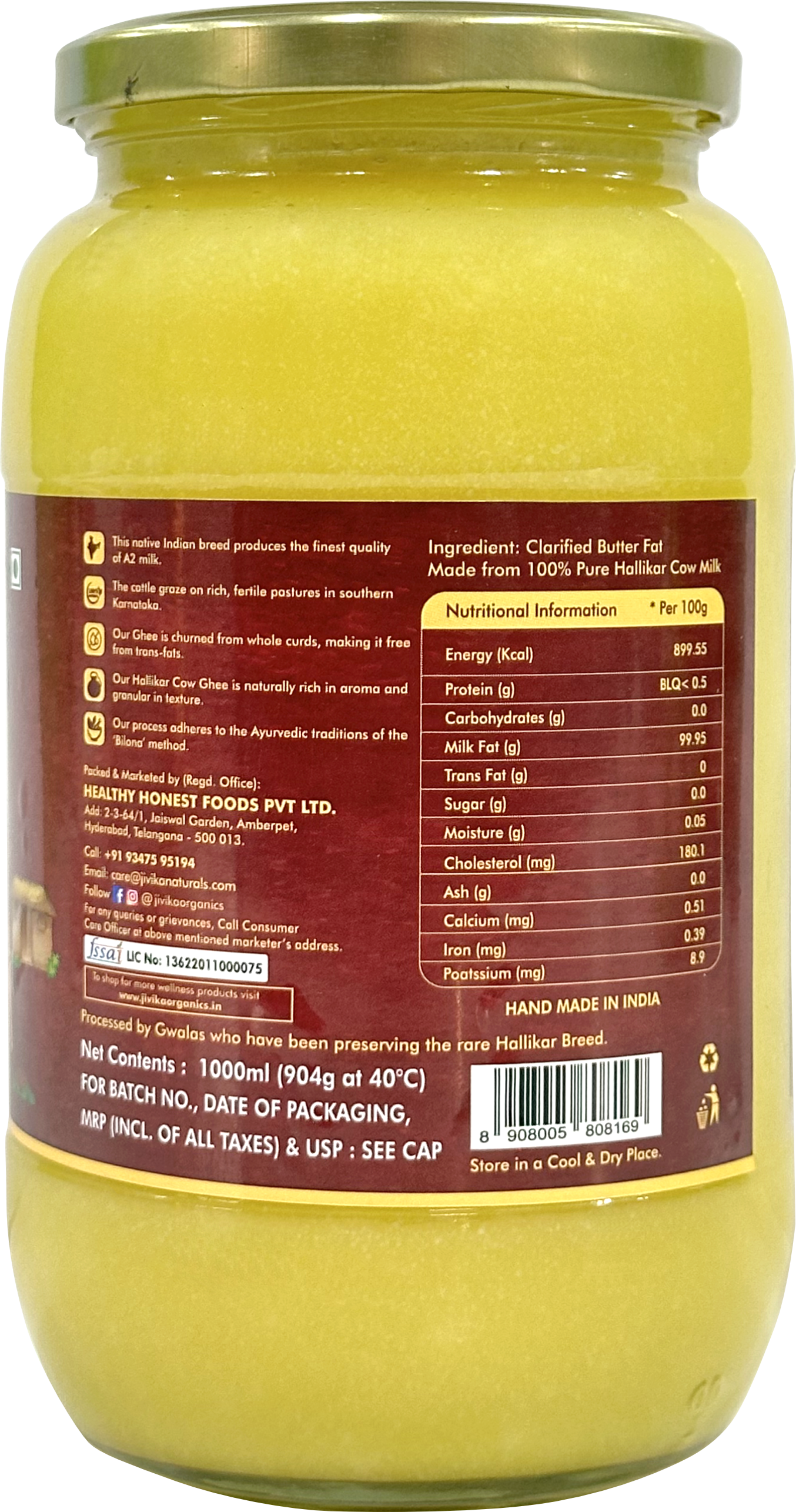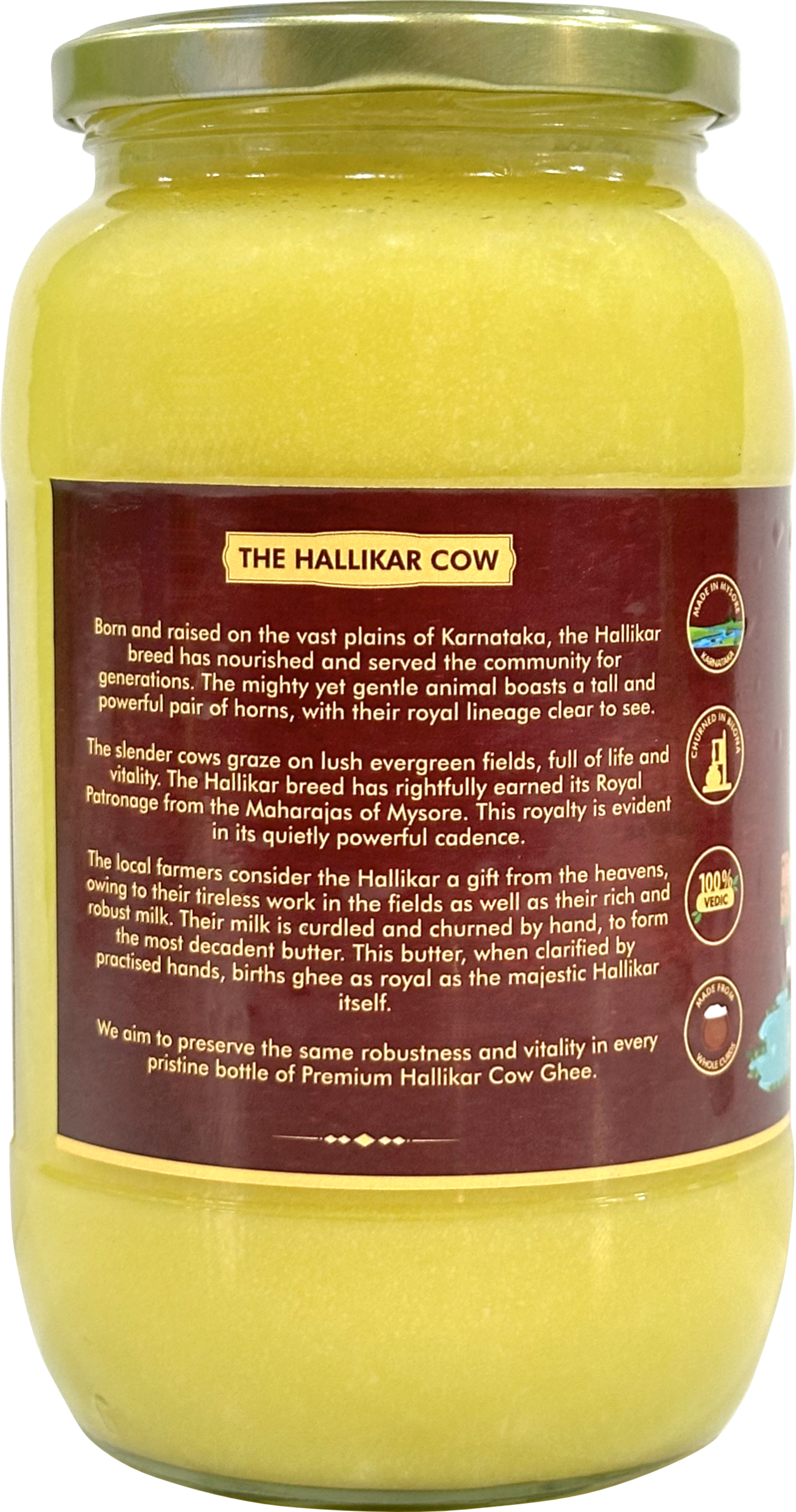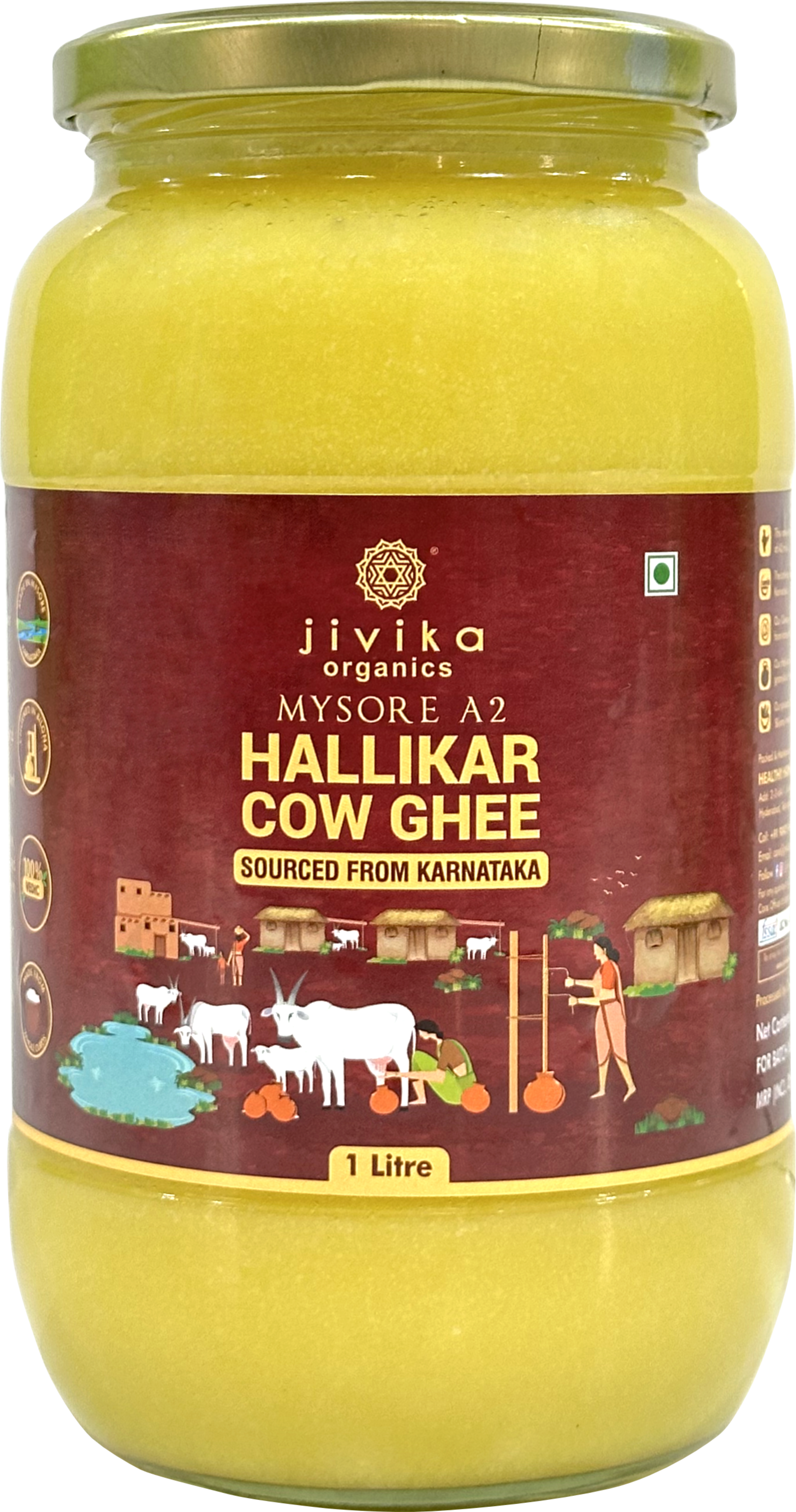 Handcrafted by the native gwalas of Karnataka, Jivika Organics A2 Hallikar Cow Ghee is rich with all the Ayurvedic benefits of traditional Bilona ghee. Churned from the nutritious Whole Curds of A2 Hallikar Cow Milk, this ghee is free from harmful trans fats and cholesterol. Each drop of Hallikar Cow Ghee is made with the principles of Purity and Authenticity above all.Jivika Organics Mysore A2 Hallikar Cow Ghee is made by native gwala communities in Kutch, Gujarat. The Royal Hallikar Cows receive the utmost care and attention from the gwalas, and the same goes for each drop of our ghee.Our Ghee is churned in earthen pots in the traditional bilateral method, ensuring quality and purity in every bottle we produce. This method produces the finest grade of nutritious ghee with zero compromise on taste.Hallikar Cow Ghee is rich in omega-3 and omega-9 fatty acids along with an abundance of antioxidants. It also has a diverse vitamin content of vitamins A, C, D, E and K.