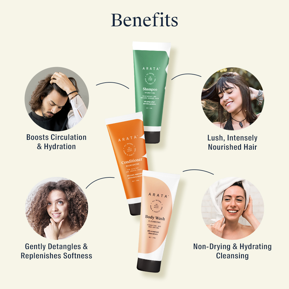 An intensely hydrating combination for your daily shower! Our hydrating shampoo and conditioner nourish and condition your strands, while our body wash cleanses away all the pollution and toxins of daily life. No harsh sulfates, parabens, phthalates, silicones, or colours.