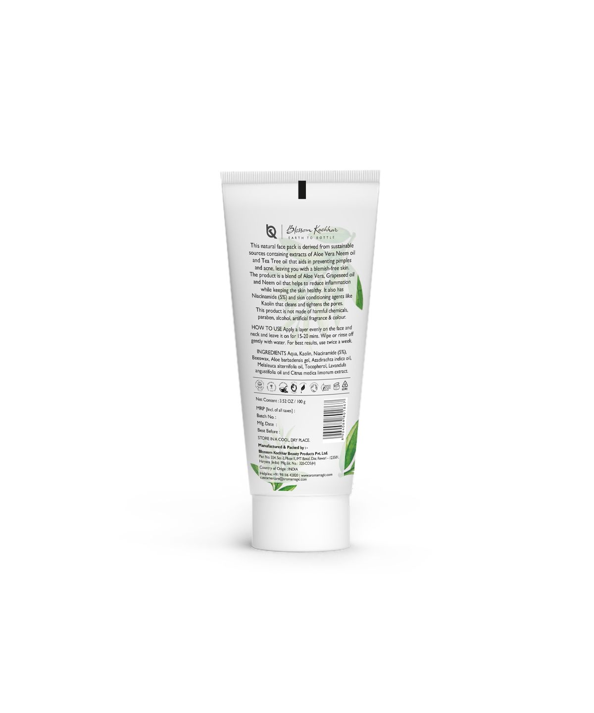 I am a natural face pack enriched with the goodness of Aloe vera, neem oil and Tea Tree oil. I prevent pimples and acne making the skin blemish-free. I help to reduce inflammation while keeping the skin healthy. The Niacinamide (5%) and other skin conditioning agents like Kaolin in me clean and tightens the pores. I am not made of harmful chemicals, parabens, alcohol, artificial fragrance & colour.