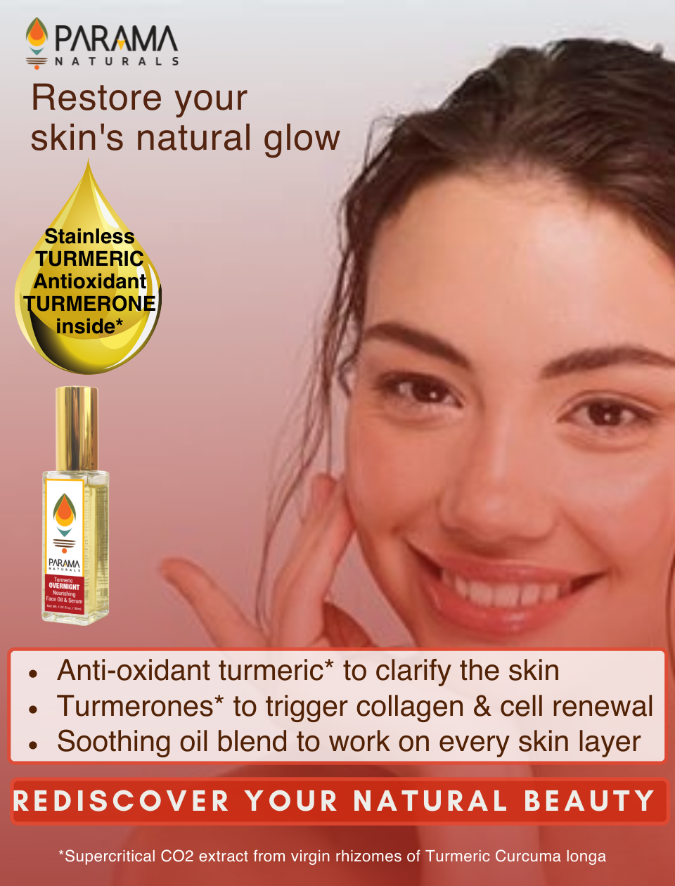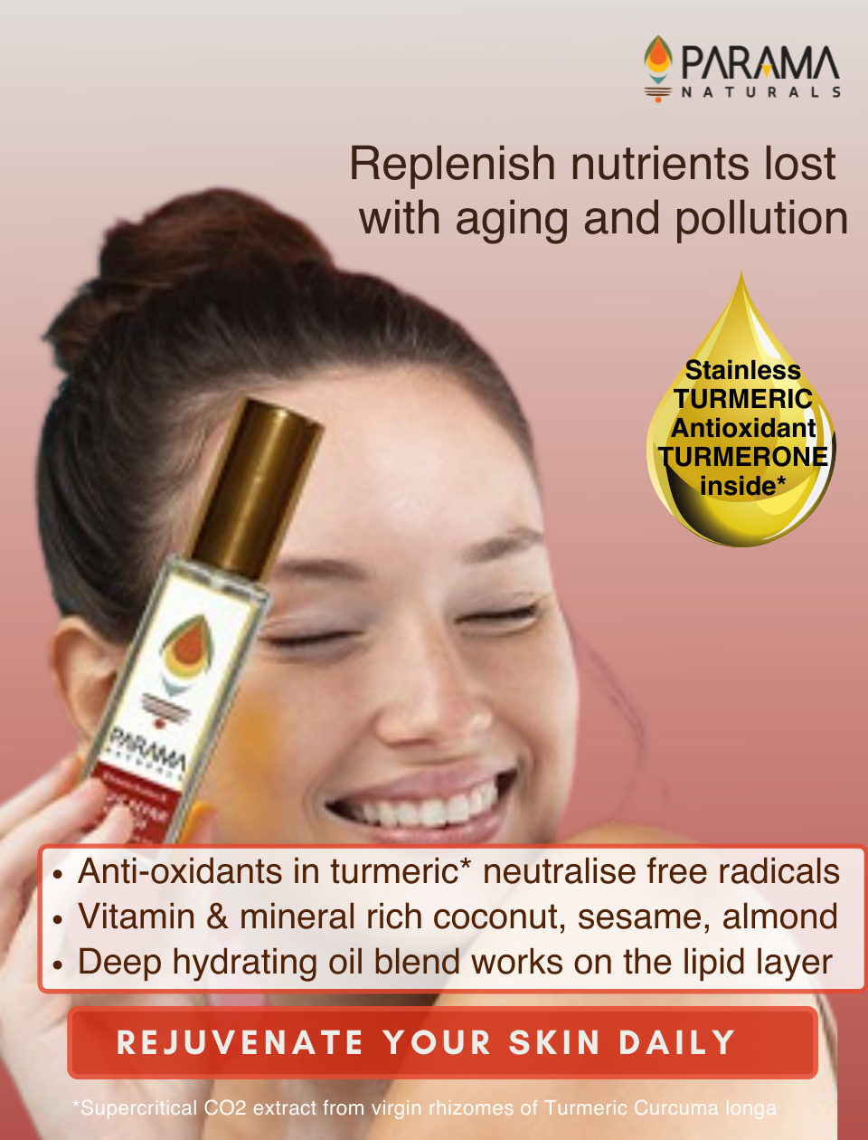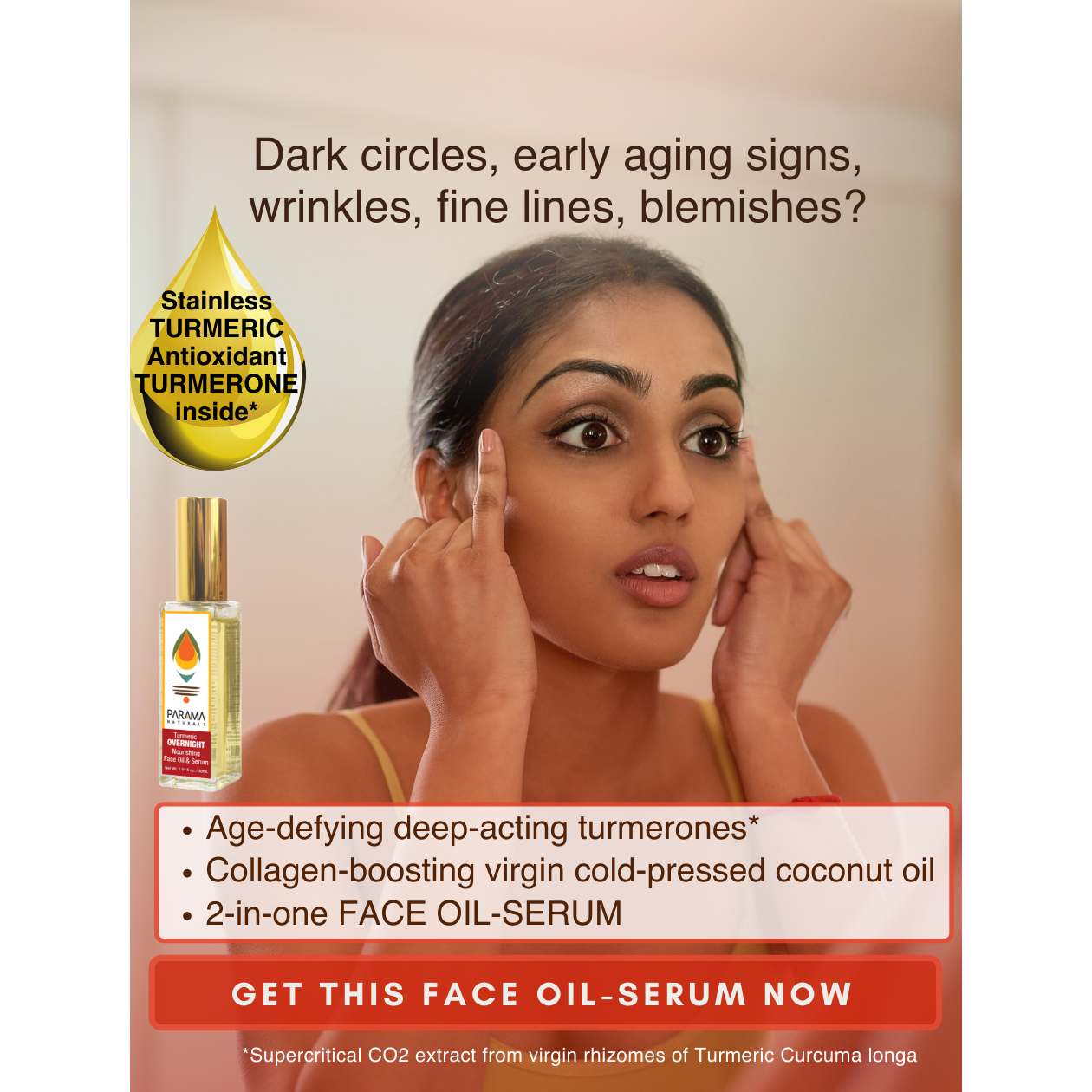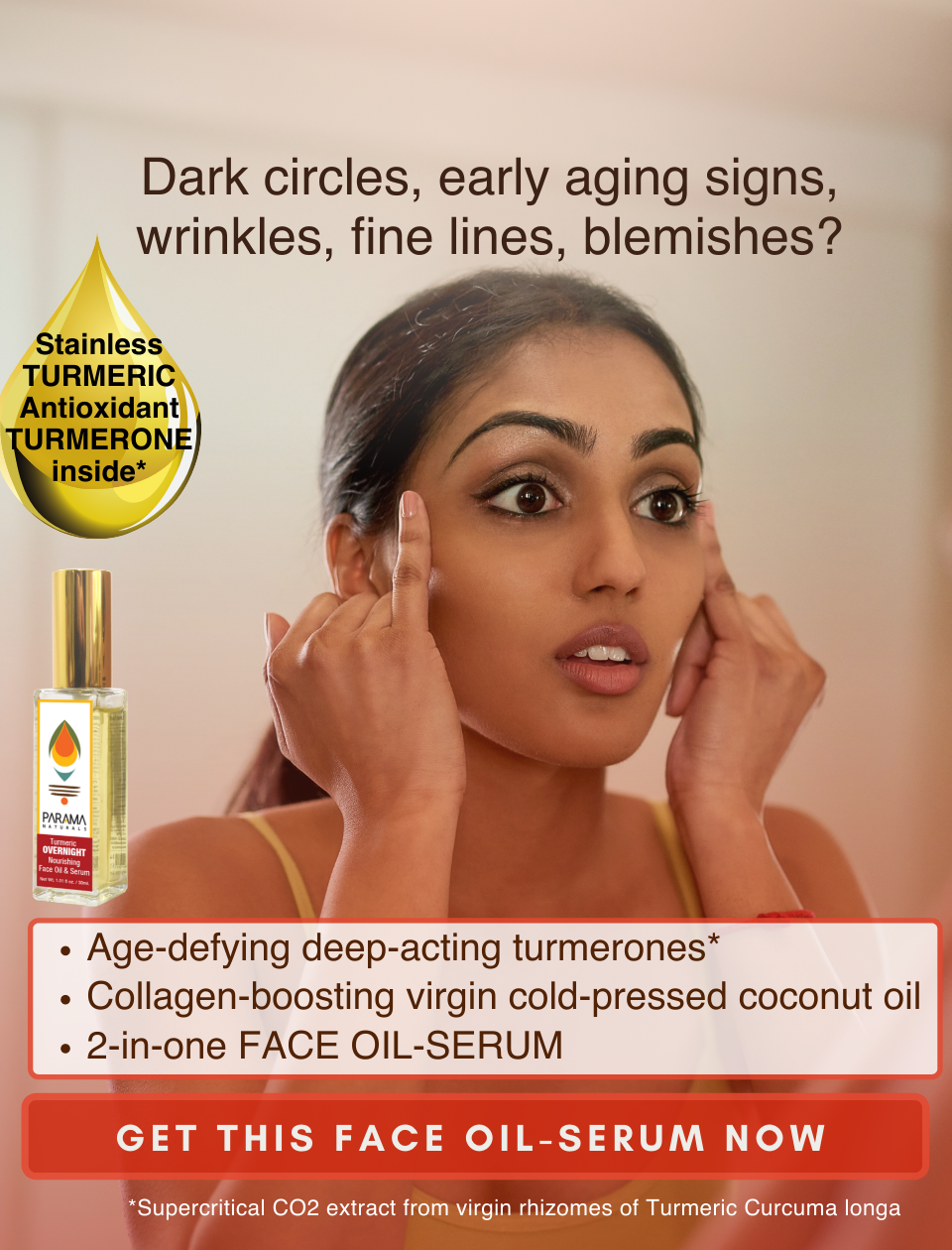 This product is an all-in-one face oil cum serum with anti-oxidant rich turmeric with other ingredients like almond, coconut and sesame. Turmeric has cosmetic, protective, preventive, healing, soothing, anti-inflammatory, anti-bacterial, anti-fungal properties, anti-anxiety, soothing, detoxifying, deep cleansing, sun-screening and skin-clarifying properties. Virgin cold-pressed oils with natural vitamins (A,E,D), minerals and fatty acids provide intense nourishment, toning, rejuvenation of dull skin, with collagen-boosting, elastin repairing, anti-scarring, deep penetrating which work on all layers of skin These ingredients collectively address issues like acne scars, blemishes, dark circles, fine lines, wrinkles, pigmentation, sunburn, rashes, uneven skin tone. It is non-greasy, quick-absorbing, stain-free and easy to use. This balanced formulation is suitable for all skin types, especially sensitive allergy-prone skin types and for day use too.