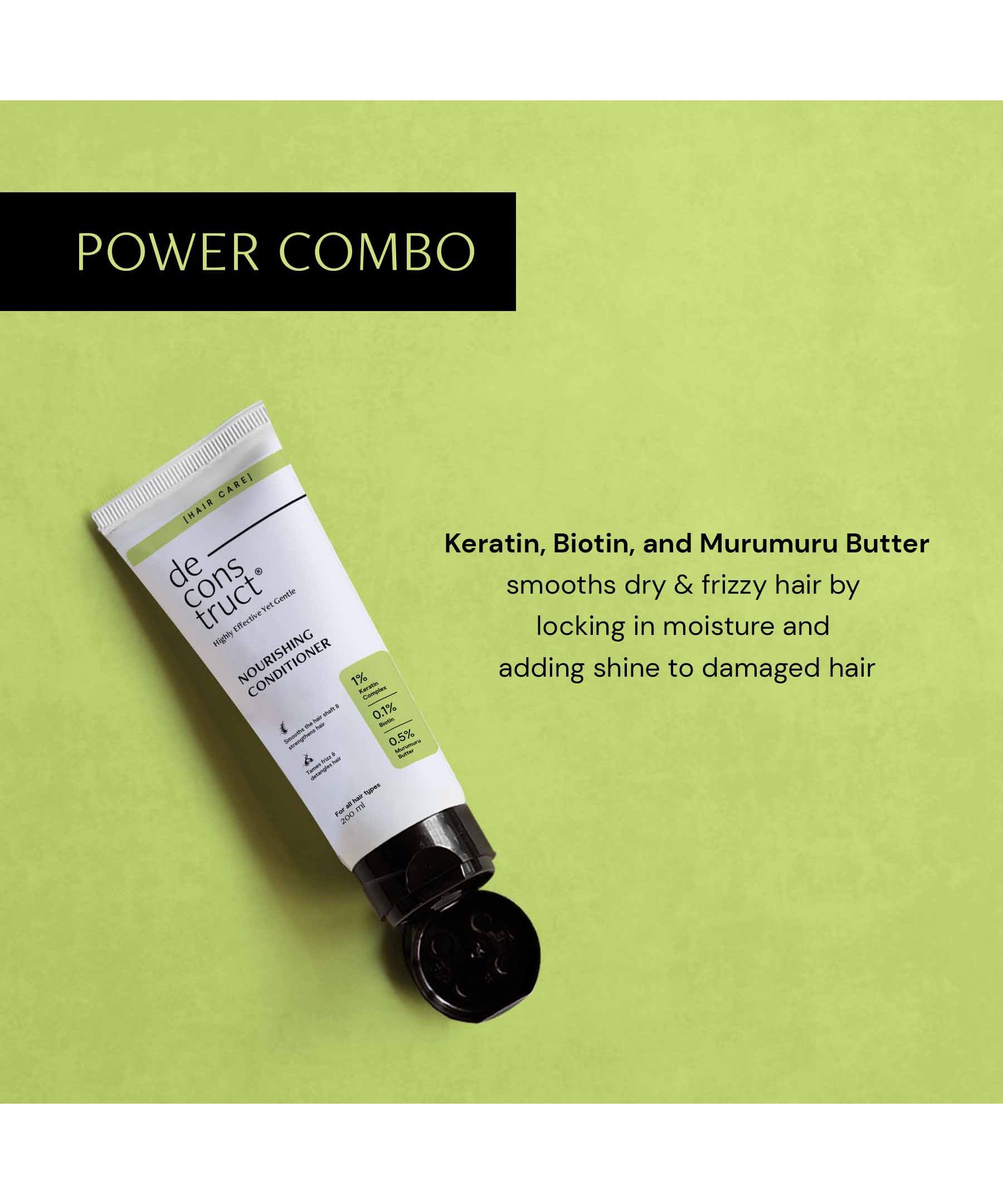 Deconstruct Nourishing hair conditioner is a Biotin + Keratin conditioner that contains the goodness of Biotin, a vitamin, and Keratin, a protein that significantly supports hair health by nourishing and strengthening the hair. Conditioner enriched with murumuru butter, provides deep moisture to the hair and maintains hydration. It also helps smooth dry and frizzy hair and adds shine to it.