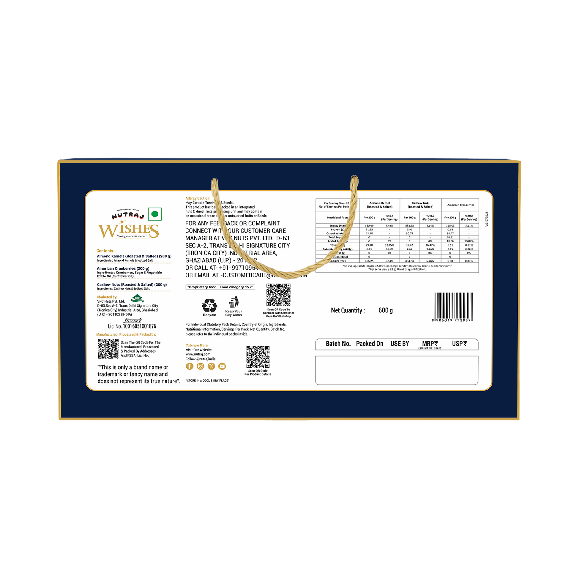 This Diwali, delight your loved ones with the Nutraj Wishes Regal Elegance 600g Gift Boxa luxurious assortment of premium dry fruits, carefully curated to spread festive joy, taste, and health. Elegantly packed and ready to gift, its the perfect choice for Diwali gifting that blends tradition with nourishment.Whats Inside? Roasted & Salted Almond Kernels 200g Roasted & Salted Cashew Nuts 200g Premium Raisins 200g From the crunchy richness of almonds and cashews to the naturally sweet burst of raisins, this regal combo offers a delicious balance of flavor and nutrition. The roasted & salted nuts add a festive crunch, while the juicy raisins bring in natural sweetnessperfect for festive snacking and sharing. Why Choose This Gift Box? Ideal for corporate gifting, family hampers & festive celebrations Hygienically packed to preserve freshness & quality A thoughtful blend of health, taste, and tradition Ready-to-gift premium packaging with a festive touch Make your celebrations truly royal with the Nutraj Wishes Regal Elegance Gift Boxa timeless Diwali gift that brings smiles, warmth, and wellness to every home.