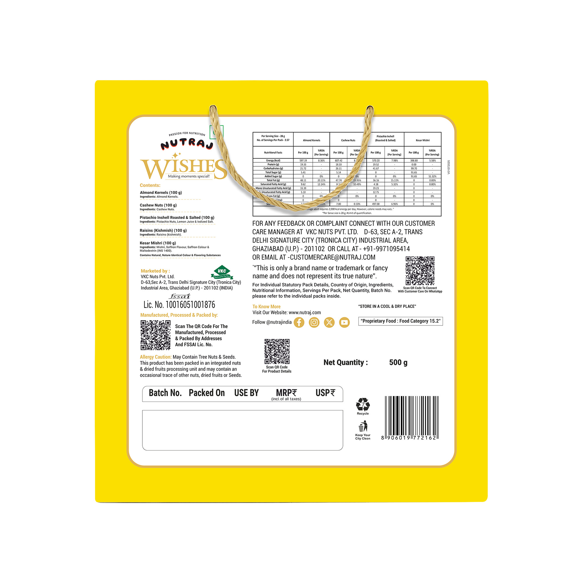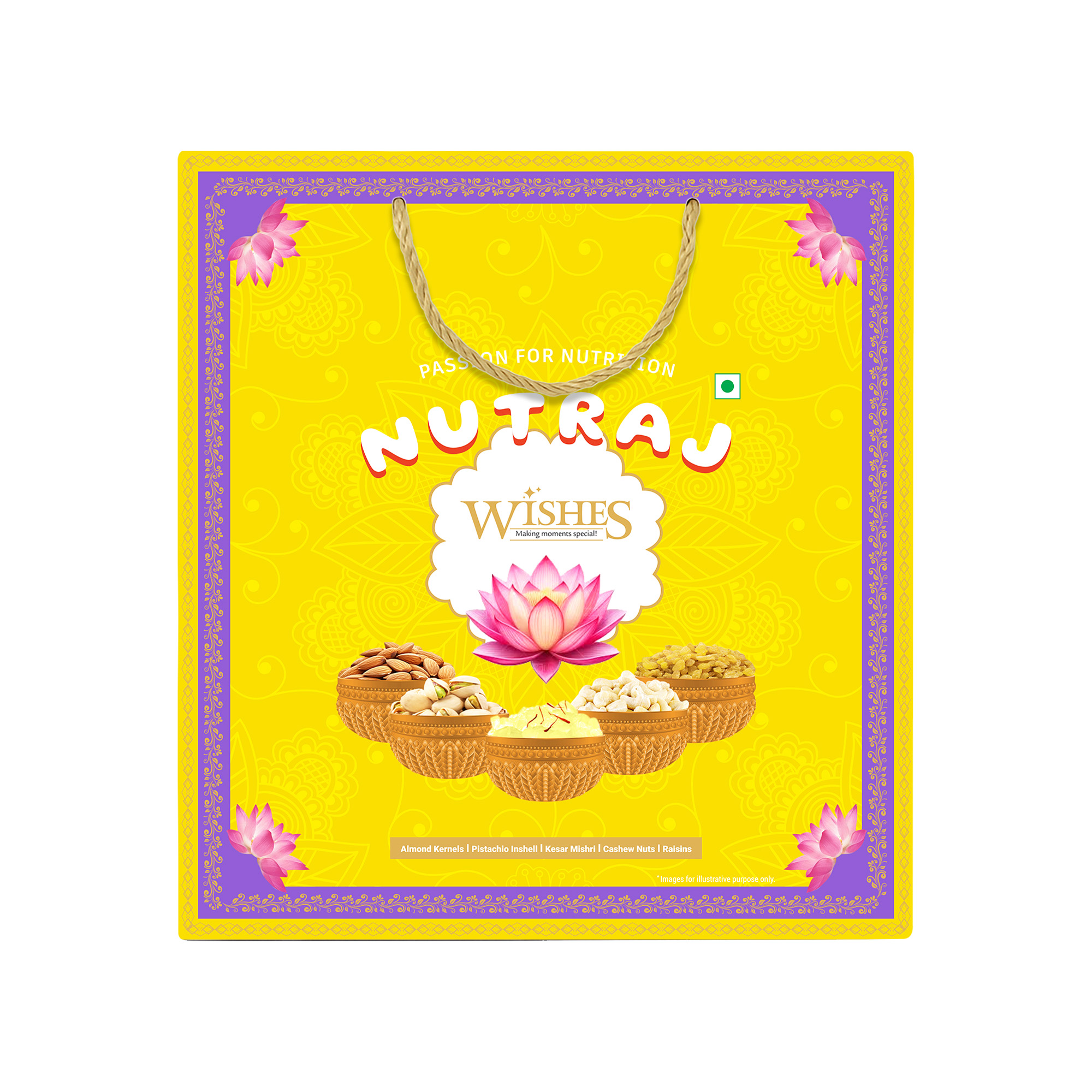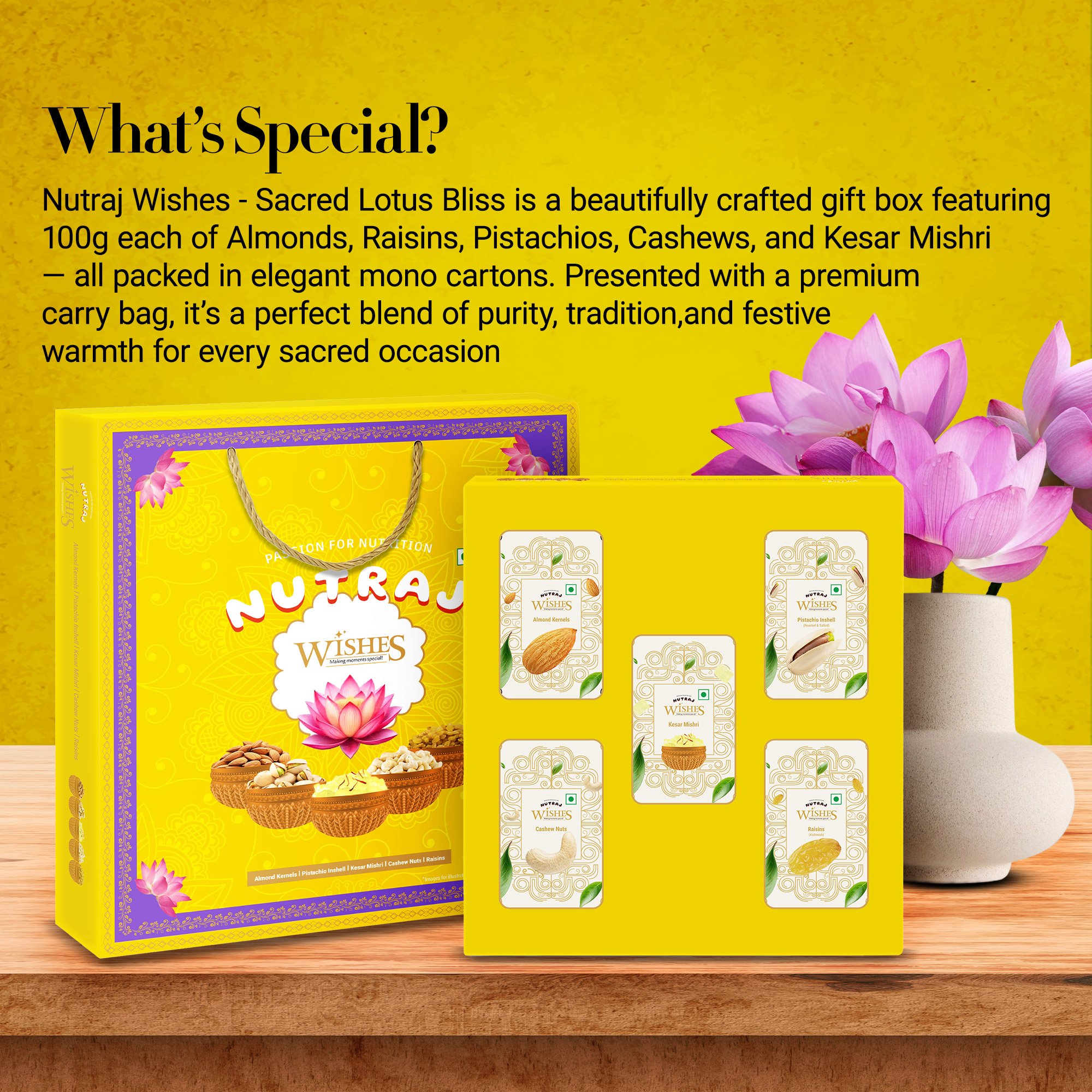 This Diwali, share the joy of health and tradition with the Nutraj Wishes Sacred Lotus Bliss Gift Box a luxurious festive assortment of premium dry fruits and traditional delights, elegantly packed to make your celebrations truly memorable. Whats Inside? California Almonds 100g Whole Cashew Nuts 100g Indian Raisins 100g Roasted & Salted Pistachios 100g Kesar Mishri 100g Thoughtfully curated to symbolize prosperity and well-being, this 500g gift box blends nutrition, tradition, and indulgence in every bite. The addition of Kesar Mishri brings a sacred touch to the box, making it a unique and auspicious choice for gifting during Diwali, Bhai Dooj, and festive celebrations. It is ideal for corporate gifting, as well as for friends and family. Let the Sacred Lotus Bliss box from Nutraj Wishes light up your loved ones hearts with health, happiness, and flavorful surprises.
