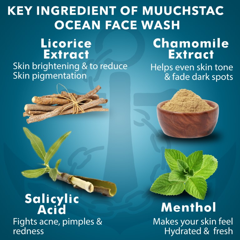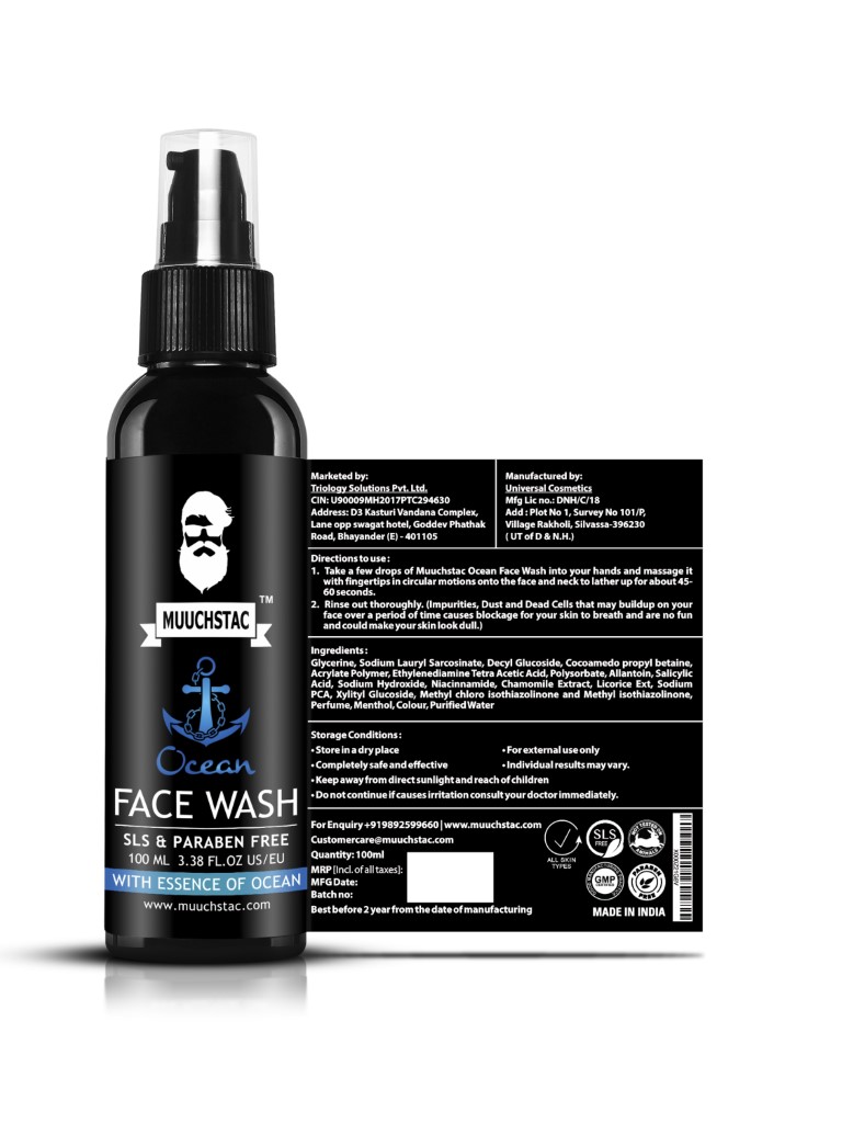 Special Features: Good for everyday use and travel ,12 hours Moisturizes, Skin Brightening, Menthol based, NO Sulphate, Silicone and Paraben. Directions: Take a Muuchstac Ocean Face Wash into Your Hands and Massage It with Fingertips in Circular Motions Onto the face wash and Neck to Lather up for about 45-60 Seconds, Rinse Out Thoroughly.
