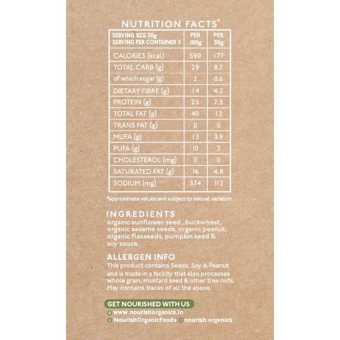 This crunchy, savory gets its delicious flavor from soy sauce - but it's the powerful blend of sunflower, buckwheat, pumpkin, and flax which makes this snack a true superfood star. It’s a perfect treat by the handful or as a topping for hummus, soup, salads, and beyond!