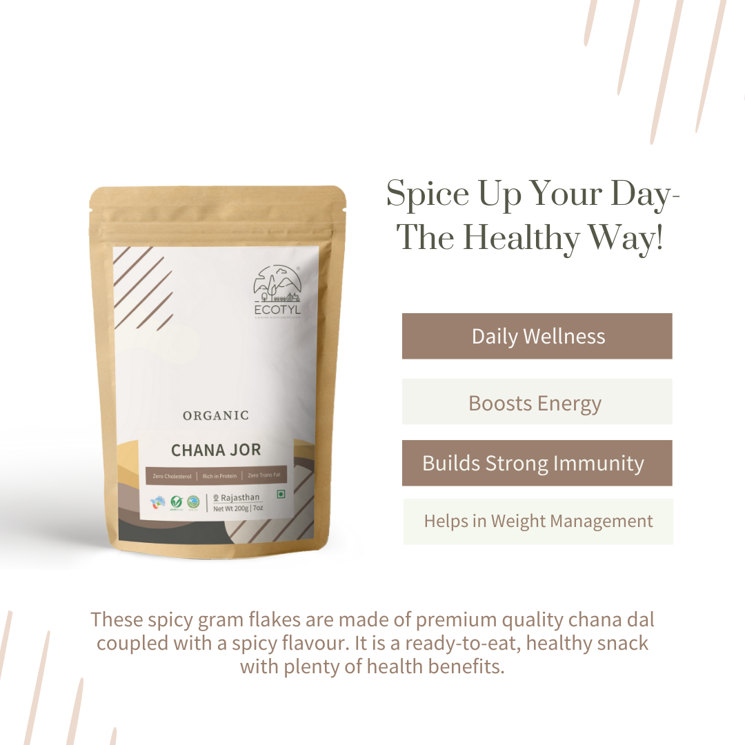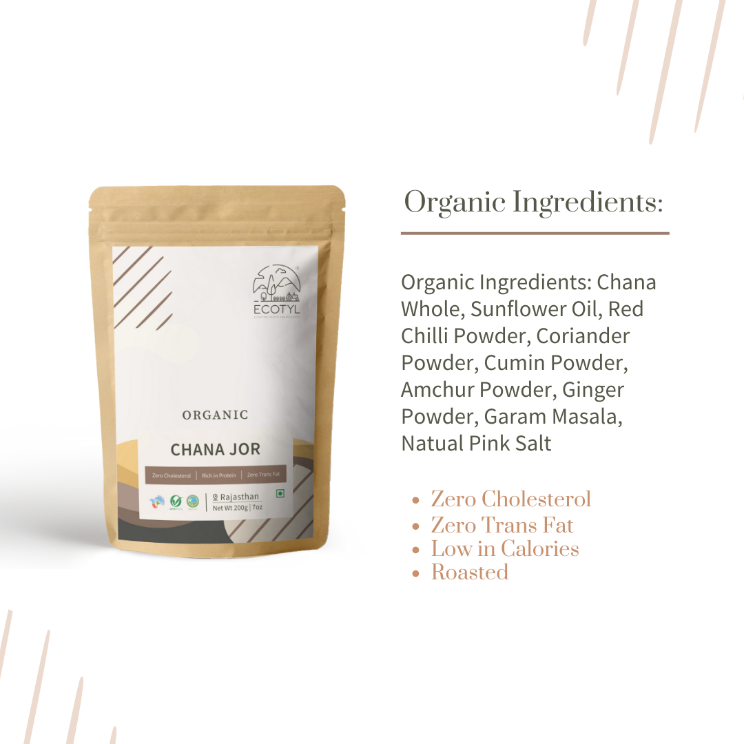 Chana Jor is an appetizing mix of roasted chana and spices. Taste and health - have the best of both worlds with this nutritious and savoury snack. Our Chana Jor is a versatile snacking option that keeps you full and also serves as a perfect evening supper or a binge-eating food. What's more? It is a low-calorie and protein-rich snack.