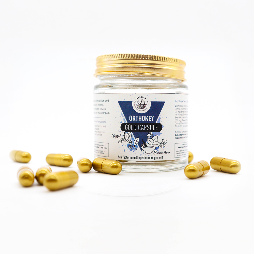 Amrutams Orthokey Gold Capsules are rich in calcium and other minerals and thus, aid in treating orthopedic disorders. These Ayurvedic capsules for muscle health contain Swarn Bhasm, Yogendra Ras and Vraht Vat Chintamani Ras. They are effective in treating joint pain, arthritis, fibrositis, lumbar spinal stenosis and frozen shoulder. It also aids in the treatment of thyroid because of its Vata balancing properties.