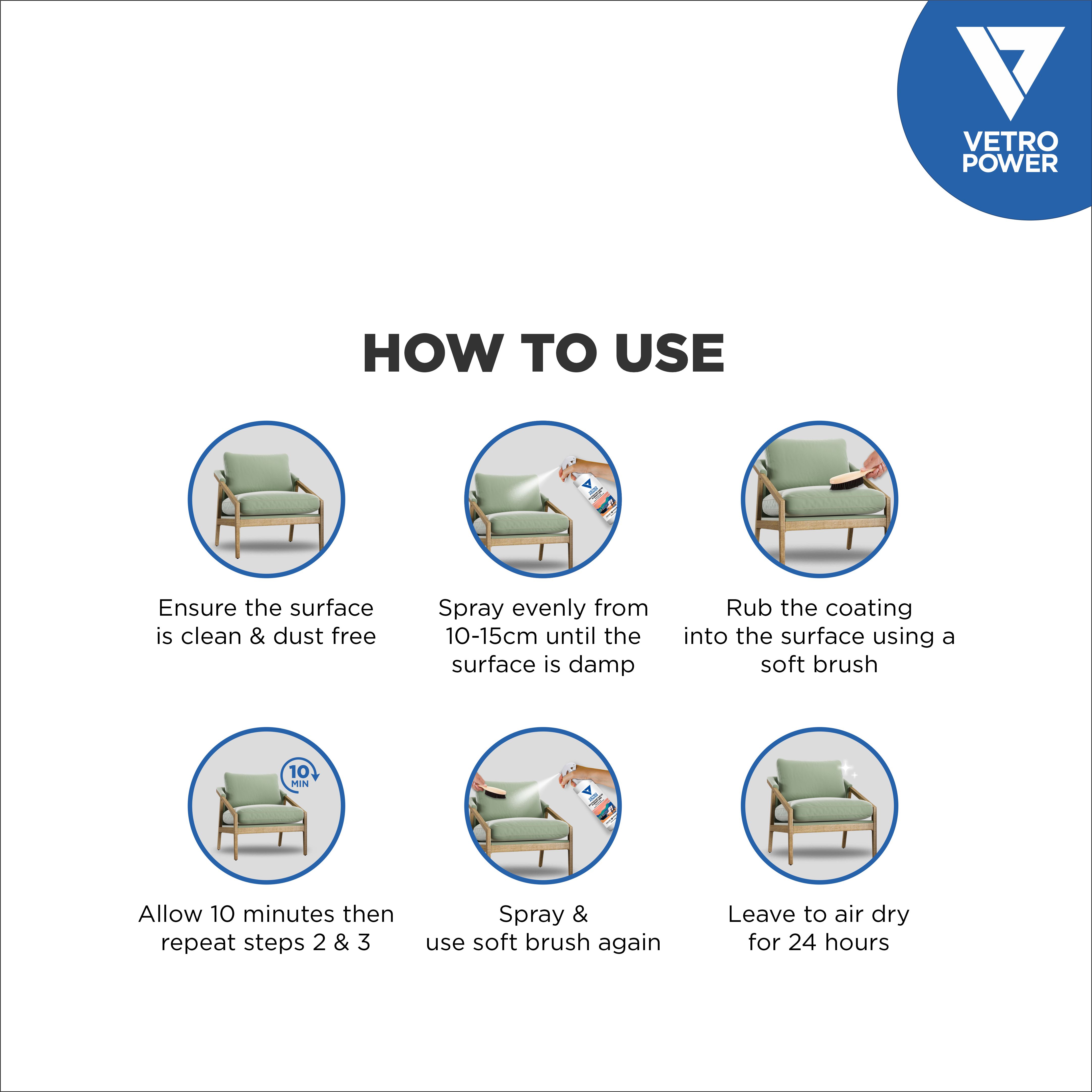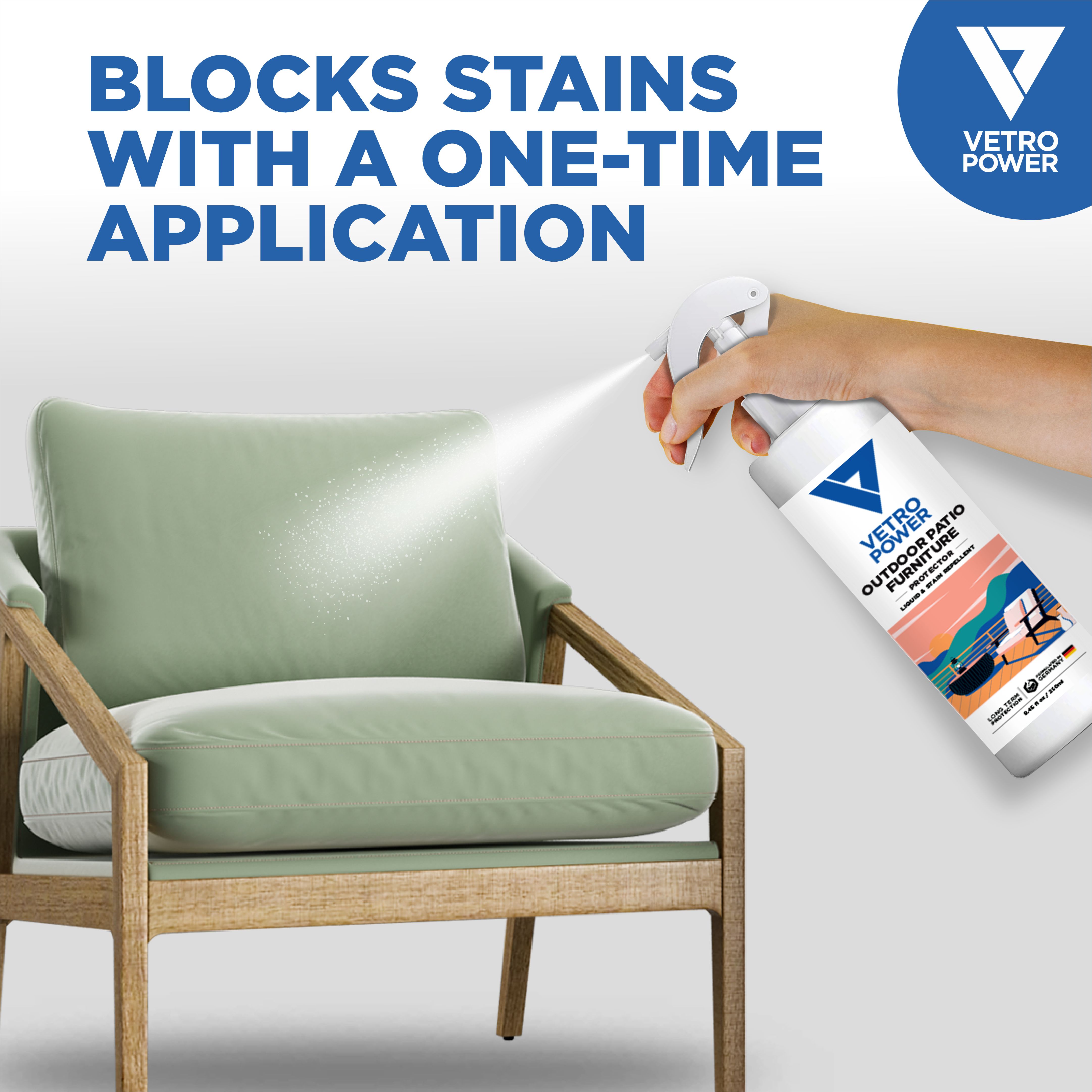 Outdoor Patio Furniture Protector Spray is a premium product designed to provide exceptional protection and durability for your outdoor furniture. This advanced spray creates a protective barrier that repels water, stains, UV rays, and other outdoor elements, ensuring that your patio furniture remains in excellent condition for an extended period. The Patio Furniture Protector Spray is formulated to be compatible with a wide range of outdoor furniture materials, including wood, wicker, metal, plastic, and more. It guards against water damage, preventing moisture from seeping into the furniture and causing warping, cracking, or mold growth. The spray also protects against stains, making it easier to clean and maintain your outdoor furniture. UV protection is another key feature of this spray. It shields your patio furniture from harmful ultraviolet rays, which can cause fading, discoloration, and deterioration of the materials over time. By reducing UV damage, the spray helps to preserve the original appearance and vibrancy of your outdoor furniture. Pay extra attention to areas exposed to direct sunlight or prone to water exposure. Allow the spray to dry thoroughly before using the furniture. Vetro Power Outdoor Patio Furniture Protector Spray is an essential product for anyone looking to protect and extend the life of their outdoor furniture. With its water-repellent properties, stain resistance, and UV protection, this spray provides comprehensive defense against outdoor elements. Keep your patio furniture looking beautiful and pristine with the reliable and long-lasting protection of Vetro Power.