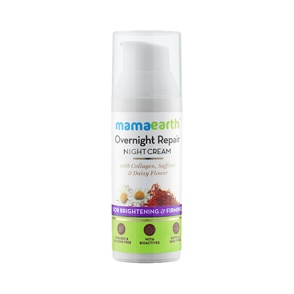 Hi! I am Mamaearth's Silicon & Paraben free skin repair night cream. My lightweight cream, ideal for all skin types, tightens, hydrates, nourishes and repairs the skin overnight. I help in restoring skin elasticity, firmness and texture. Daisy Flower lightens and evens skin tone. Collagen CLR is designed for the care of dry and inelastic ageing skin, and to help prevent the skin from damage caused by day to day hustle and pollution. Dermatologically tested, I am totally free of skin damaging ingredients like sulfates, paraben, alcohol, mineral oil, silicones, petrolatum and synthetic fragrances.