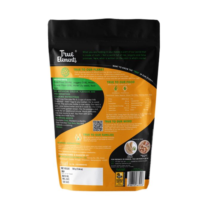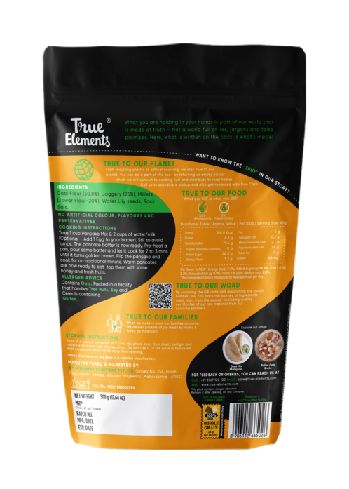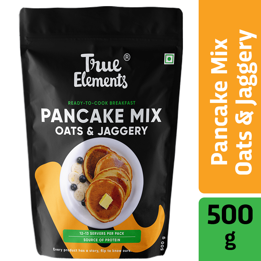 Pancakes are loved by all and easy to make pancake mixes is the best fuss-free option to make and enjoy them. The mixes available in the market are made with all purpose flour (maida), sugar, baking soda & baking powder which causes bloating & digestive problems.True Elements Pancake mix is made of Oats & Jowar flour. We use freeze dried curd, a healthy fermenting agent instead of baking soda & jaggery instead of sugar to make pancakes a guilt-free snack. These are perfect for kids or even adults to get their dose of protein and nutrition through these tasty pancakes. You can top these pancakes with fresh fruits, raw honey or some chocolate sauce, the options are endless.