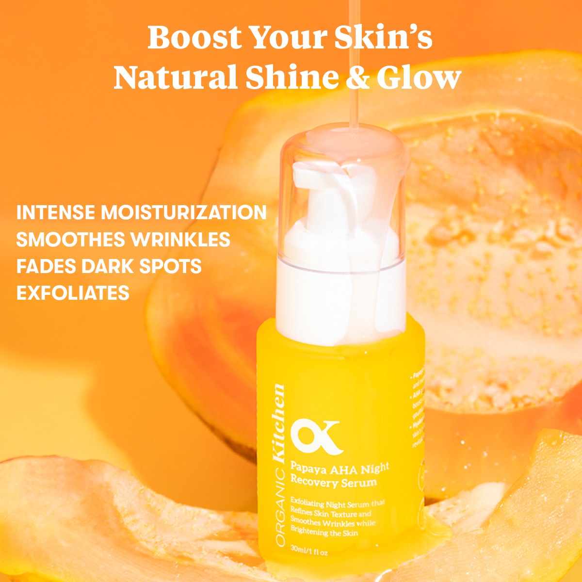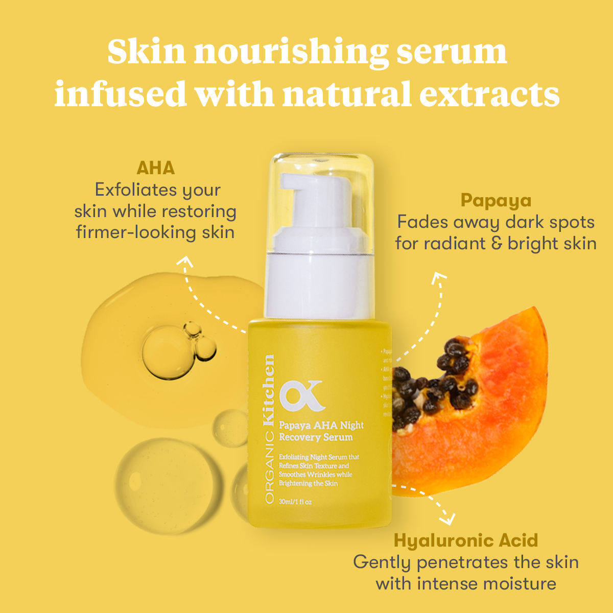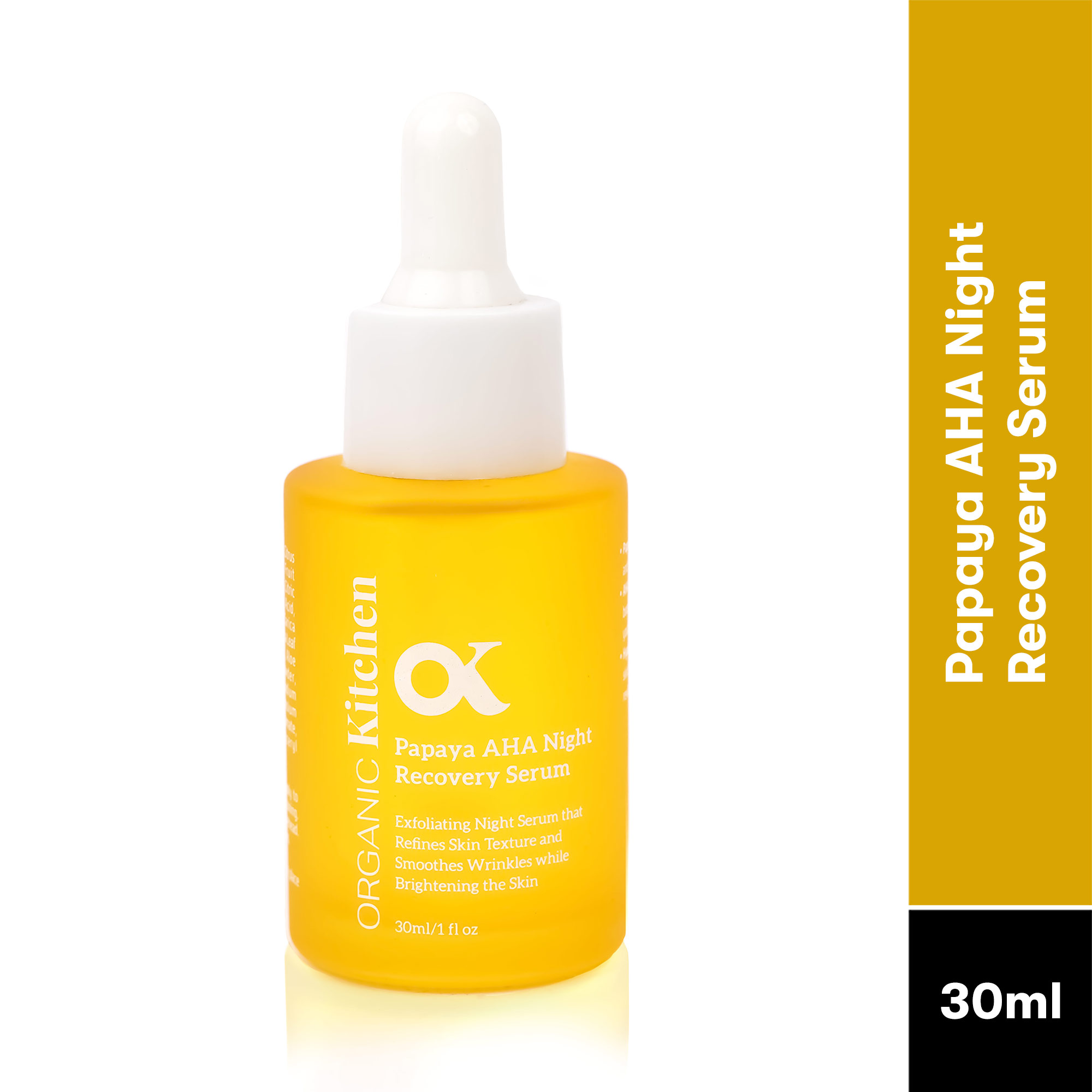 This Papaya AHA Night Recovery Serum will give your skin a rejuvenated look with the combination of Papaya, AHA, and Hyaluronic acid. AHA helps in exfoliating the skin by removing impurities and dirt. This serum delivers an even-toned and nourished skin to give you a refreshed look by removing dead skin cells and revealing a fresh one. Papaya and Hyaluronic acid hydrates the skin and makes it look plump and smooth. This lightweight skin hydrating serum is all you need to get that bright and healthy look.