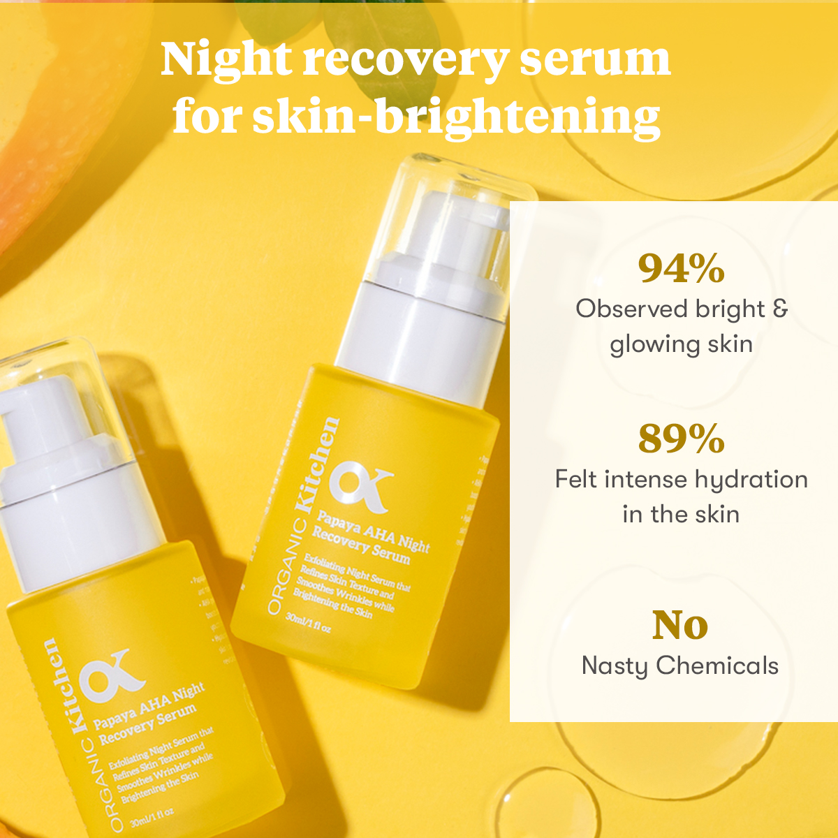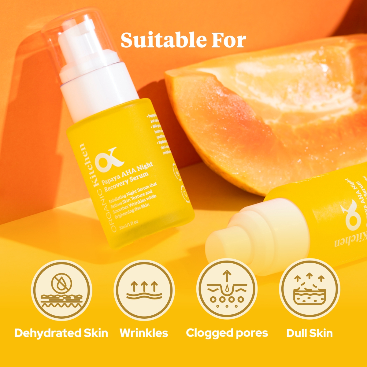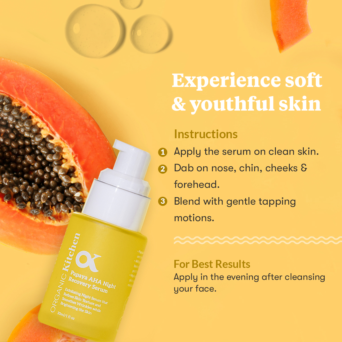 This Papaya AHA Night Recovery Serum will give your skin a rejuvenated look with the combination of Papaya, AHA, and Hyaluronic acid. AHA helps in exfoliating the skin by removing impurities and dirt. This serum delivers an even-toned and nourished skin to give you a refreshed look by removing dead skin cells and revealing a fresh one. Papaya and Hyaluronic acid hydrates the skin and makes it look plump and smooth. This lightweight skin hydrating serum is all you need to get that bright and healthy look.