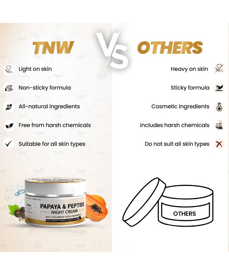 Do you know that skin manifold its healing process overnight? Using the right night cream is the key! TNW introduces you to the Papaya & Peptide Night Cream that helps to improve the skins overall texture by boosting collagen production. With active ingredients like papaya, peptide, hyaluronic acid, and panthenol, this non-sticky night cream helps to reduce the visibility of fine lines, wrinkles, pigmentation, and darkness while deeply moisturizing the skin. Besides, it calms irritation and makes skin super soft & hydrated. Suitable for all skin types, this night cream work wonders on your skin. To witness the effective results, you must use this night cream regularly.