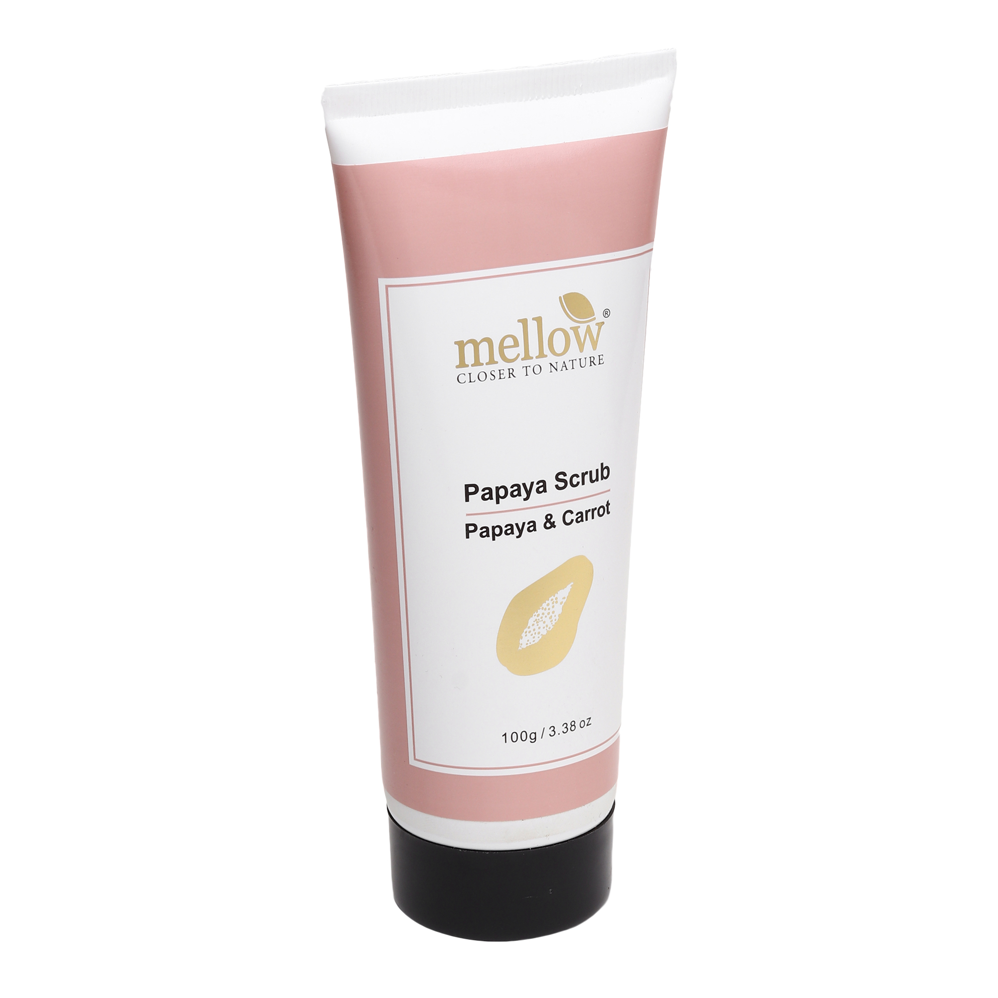 Mellow's Papaya Scrub is a natural composition of vitamin-rich ingredients like lemon peel, papaya, orange peel, walnut and carrot seeds. The ayurvedic formula for skin casts stellar tightening properties, removes dead skin, prevents wrinkles, and makes skin look smooth. The nutrients of walnuts keep your skin looking plump and glowing. Papaya Scrub is rich in enzymes that decrease inflammation. This product helps reduce acne by removing dead skins that clog pores. The vitamin rich papaya scrub treats dark spots, acne, blemishes, and leaves you with soft skin.