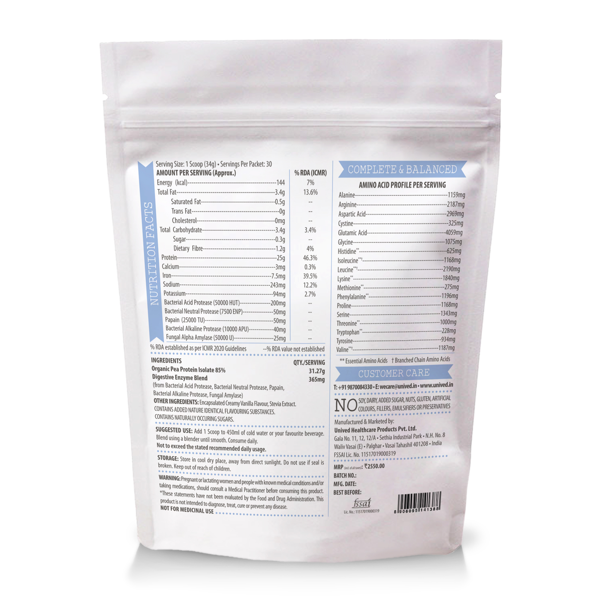 A Complete Vegan Protein for Muscle Repair & Maintenance Pea Protein is a rich source of BCAAs (Leucine, Isoleucine and Valine) which are of particular interest to athletes. Each serving of Unived Pea Protein delivers 4.54g natural occurring BCAAs to ensure that your workouts are optimally energised, and that your bodys resources are effectively utilized towards the goal of building lean muscle mass & muscle thickness like whey protein. As a completely plant-based protein, our pea protein has an extremely high digestibility of 98%, making it a rich source of highly bio-available and easily accessible amino acids.