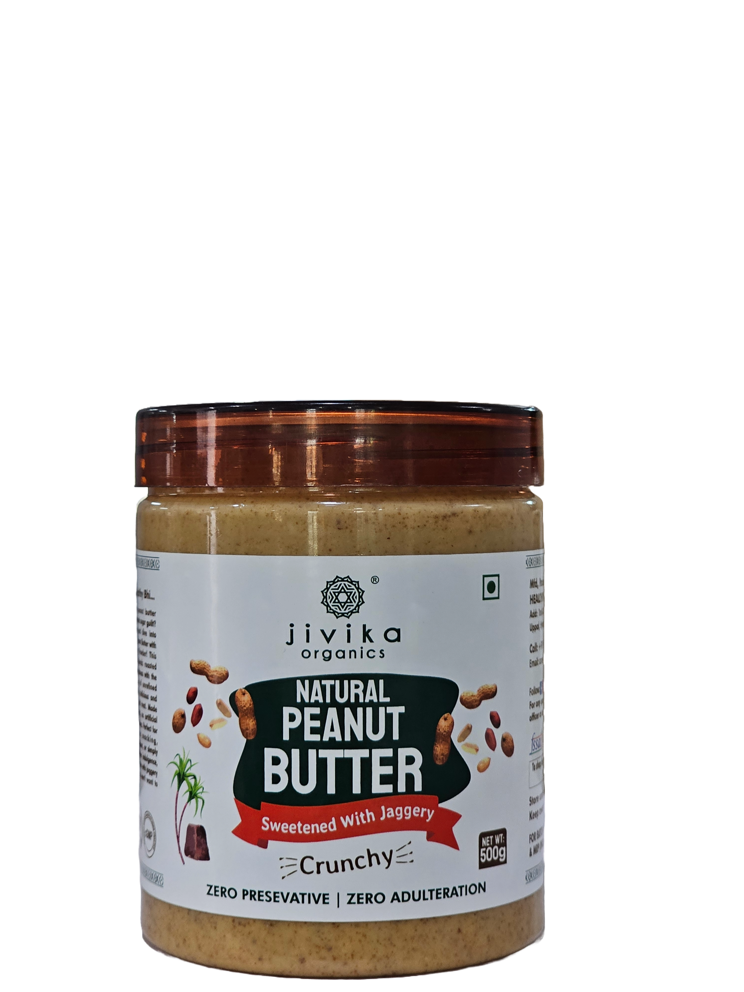 Jivika's Natural Peanut Butter is a delicious and nutritious spread made with simply roasted peanuts and sweetened with natural jaggery. This protein-packed treat is perfect for anyone following a healthy lifestyle, especially fitness enthusiasts. Jaggery, an unrefined sugar, provides a touch of sweetness without the drawbacks of added sugars. Free from artificial ingredients and preservatives, Jivika Peanut Butter lets you enjoy the pure, wholesome taste of peanuts. Experience the satisfying crunch in every spoonful, whether you spread it on toast, add it to smoothies, or indulge straight from the jar. Fuel your workouts, satisfy your cravings, and nourish your body with Jivika Natural Peanut Butter.