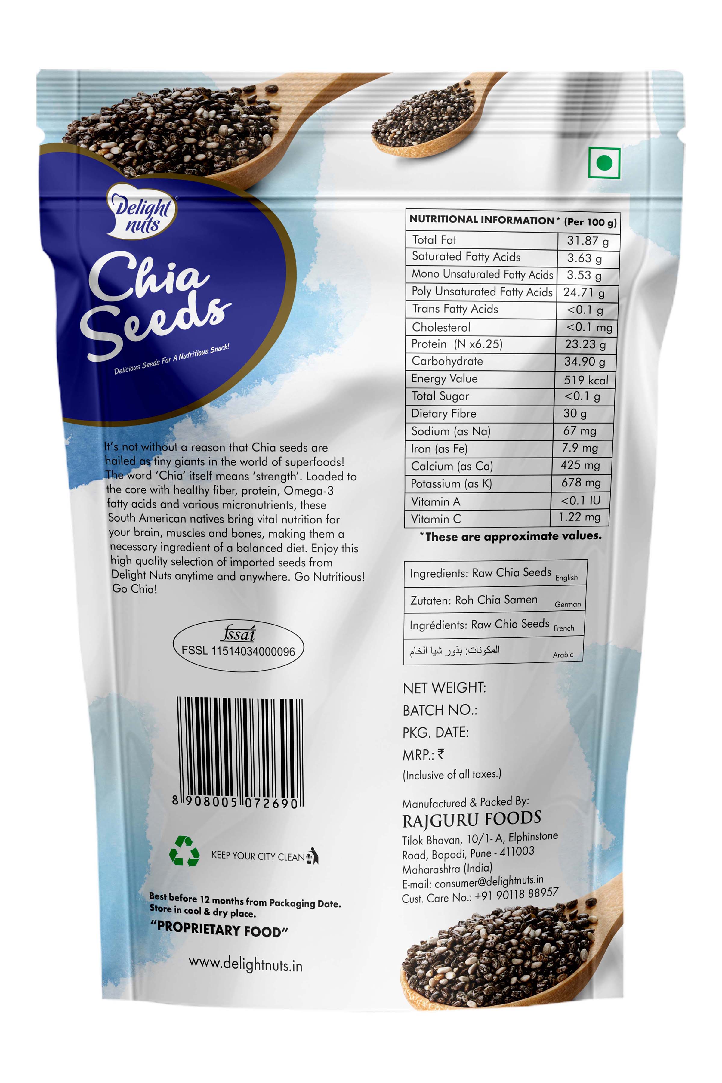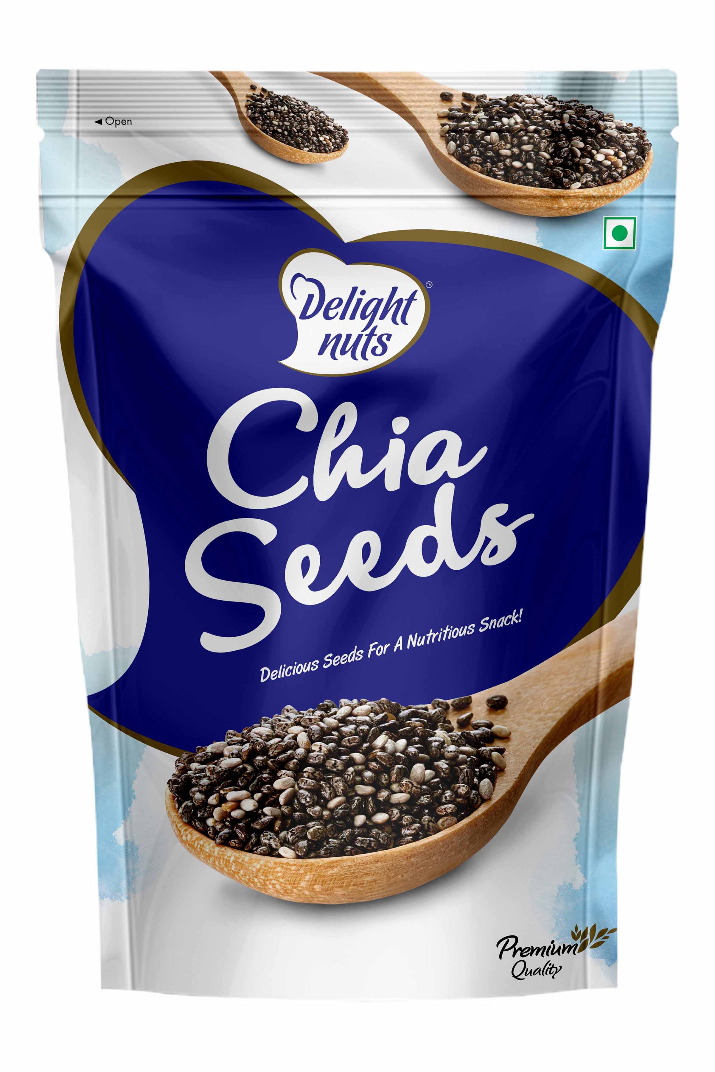 It's not without a reason that Chia seeds are hailed as tiny giants in the world of superfoods! The word 'Chia' itself means strength'. Loaded to the core with healthy fiber, protein, Omega-3 fatty acids and various micronutrients, these South American natives bring vital nutrition for your brain, muscles and bones, making them necessary ingredient of a balanced diet. Enjoy this high quality selection of Chia seeds from Delight Nuts anytime and anywhere. Go Nutritious! Go Chia !"
