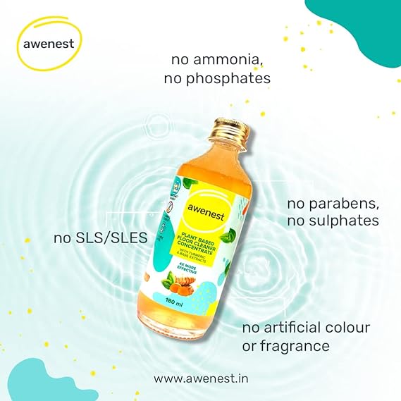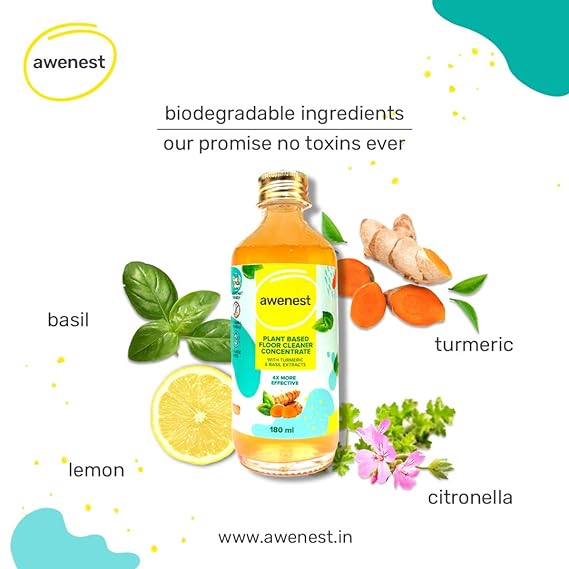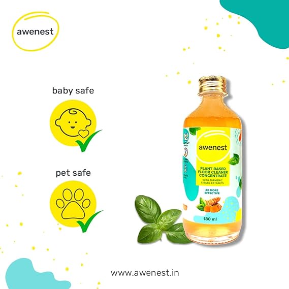 Awenest floor cleaner is a concentrate - 180 ml of this concentrate is equivalent to 720 ml of a standard floor cleaner. Just 2 drops from the dispenser pump are enough for 4 litres of water. This floor cleaner is made using 100% plant-based ingredients, making it a healthy and eco-friendly choice. Additionally, awenest floor cleaner concentrate is packaged in a glass bottle, ensuring that it doesn't contribute to plastic waste. Awenest floor cleaner is formulated with the natural cleansing power of coconut vinegar, turmeric, lemon and cardamom. With natural essential oils, citronella and basil, your house smells fresh and insects are kept at bay. Owing to its plant-based formulation, this floor cleaner is safe for you, pets and your kids.