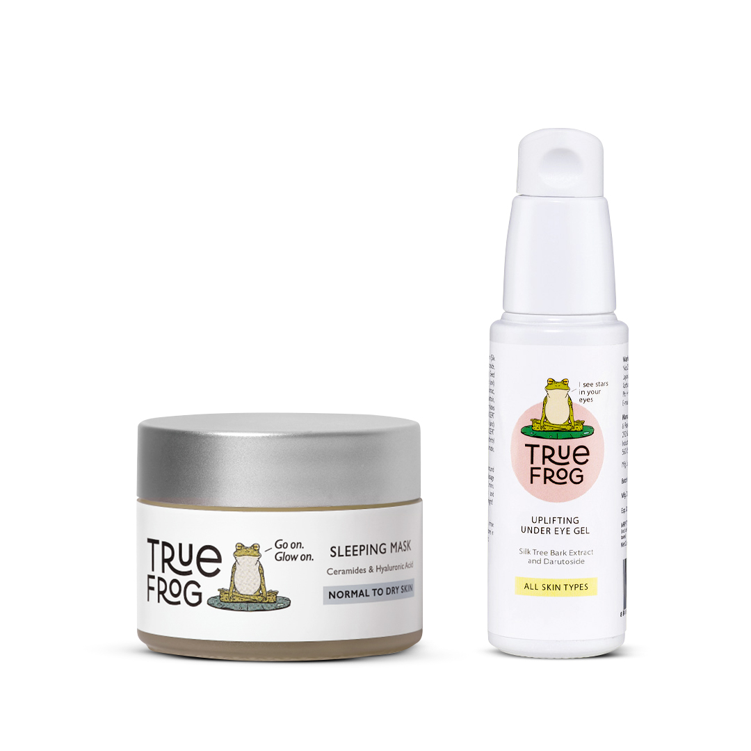 2. Uplifting Under Eye Gel - 30gm - True Frog Under Eye Gel is a brilliant Vegan infusion of AlbiziaJulibrissin (Silk Tree) Bark Extract (and) Darutoside, Bakuchiol, Cannabis Sativa (Hemp) Seed Oil, and Sodium Hyaluronate which acts as an anti-aging agent, protects, conditions, and rejuvenates the under-eye skin. An effective treatment is to wake up and activate the skin gently.