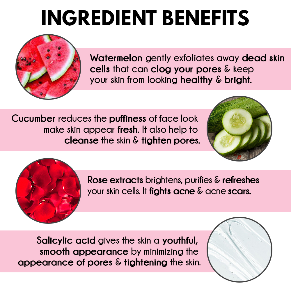- Watermelon, Cucumber, Rose Extracts, Salicylic Acid, Glycerin, Jojoba Ester