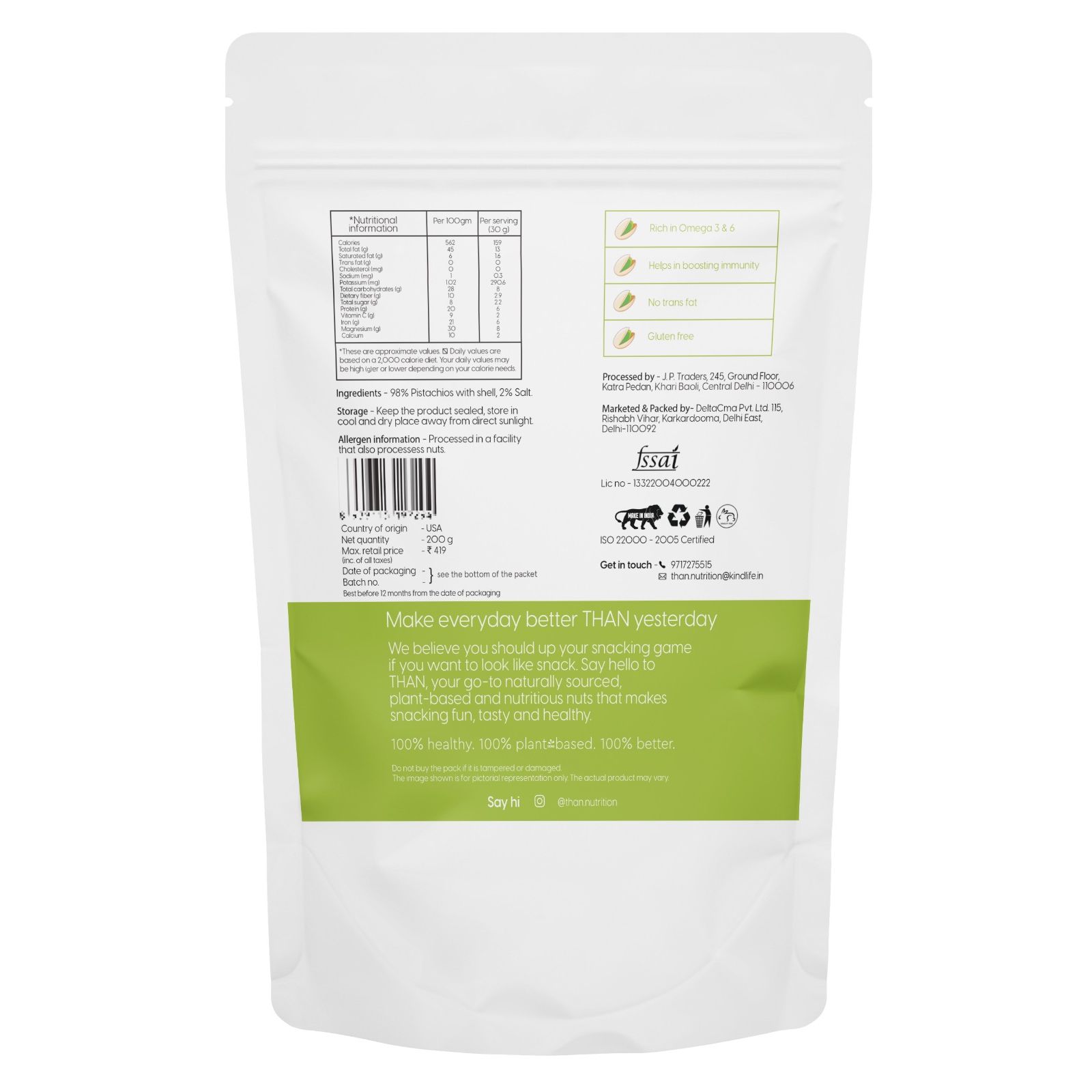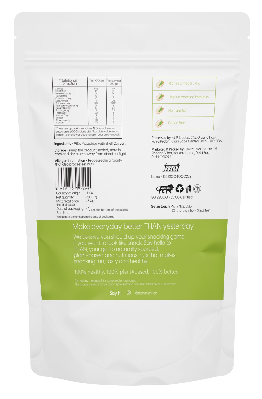 Our pistachios are free from gluten, GMOs, and artificial additives, making them a wholesome choice suitable for vegan diets. Indulge in their goodness guilt-free. Take THAN Crunchy Pistachios with you anywhere using our convenient, resealable bag. They stay fresh and are perfect for on-the-go snacking. Rich in heart-healthy fats and essential nutrients, THAN Crunchy Pistachios contribute to overall well-being, promoting a healthy cardiovascular system. Taste the exceptional flavor, crunch, and wholesome nutrition of THAN Crunchy Pistachios. Order now for a guilt-free snack that fuels your body, satisfies your cravings, and supports your active lifestyle.