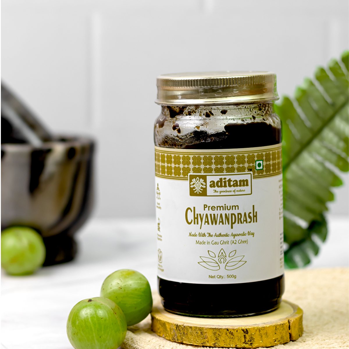 Aditam's Premium Chyawanprash is prepared in an authentic ayurvedic way in Gau Ghrit (A2 Ghee) processing more than 50 medicinal herbs and their extracts, including the prime ingredient, Amla (Indian gooseberry), which is the worlds richest source of vitamin C, Ashwagandha, Gokshura, Pippali, Shatavari, Brahmi and many more ancient herbs.