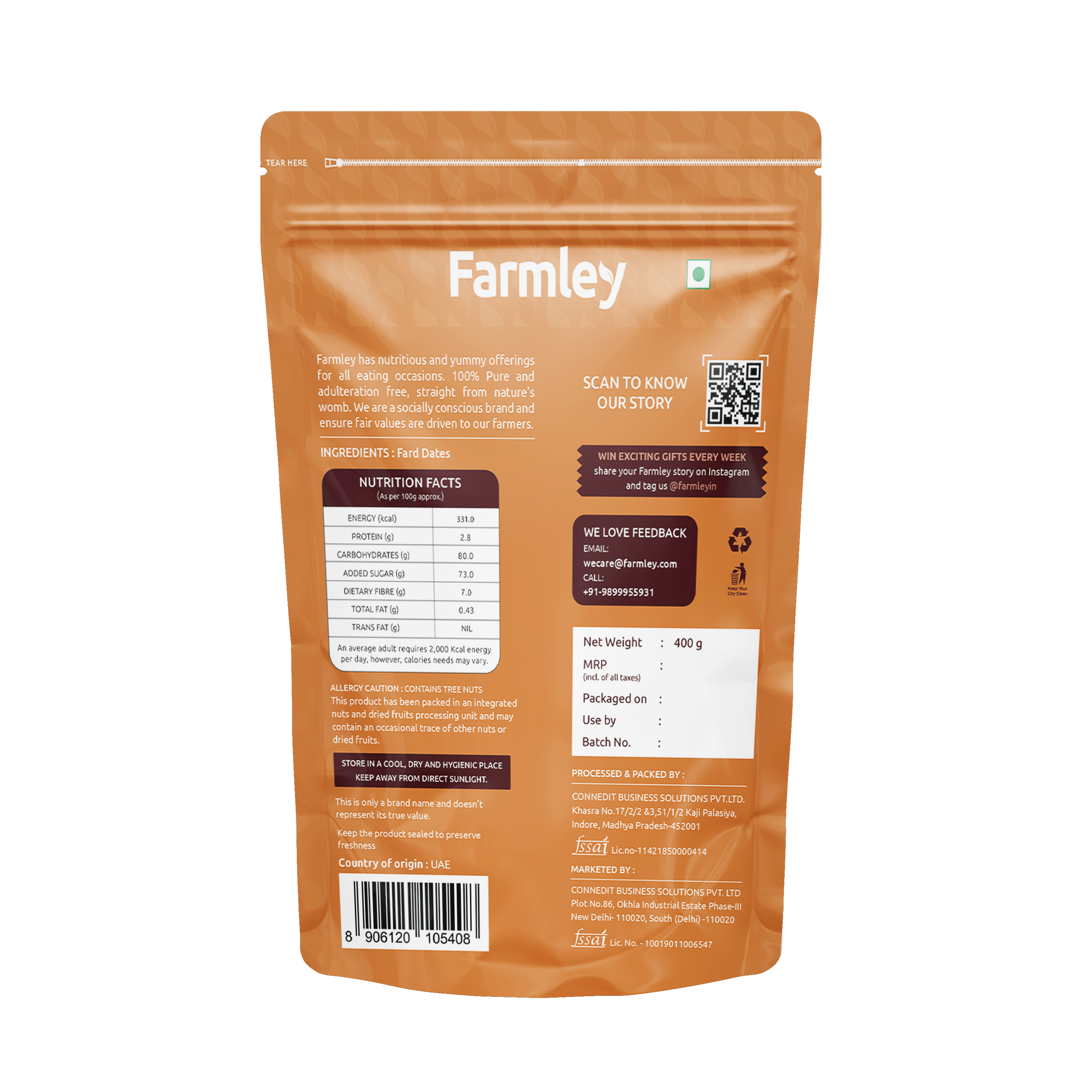Very nutritious, High in fiber, High in disease-fighting antioxidants, Promote brain health and Promote natural labor. Since they are naturally sweet, they're a perfect choice for people with diabetes since it does not contain sugar. Anytime guilt-free snacking: Snack on them at any time of the day or night when you feel hungry or low on energy. Resealable Standee pouch for on-the-go nutrition. Bad quality dates can be wrinkled and hard to touch. Farmley brings the best quality that are 100% naturally sourced, plump, shiny and free from additives and preservatives.