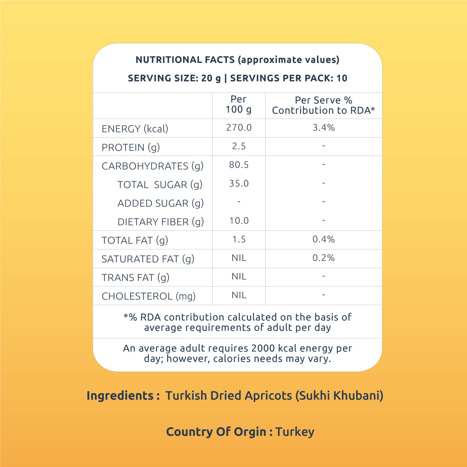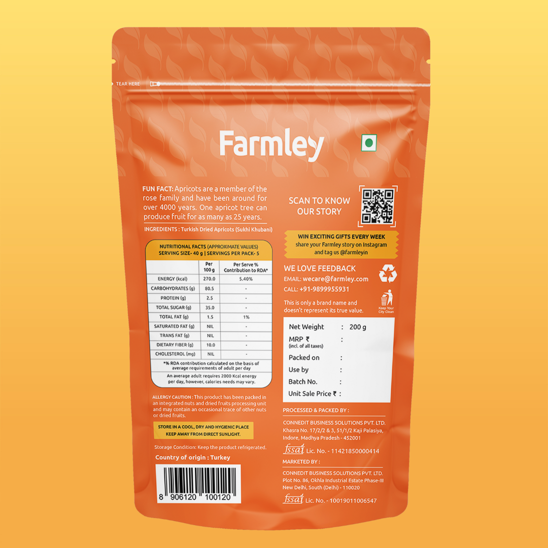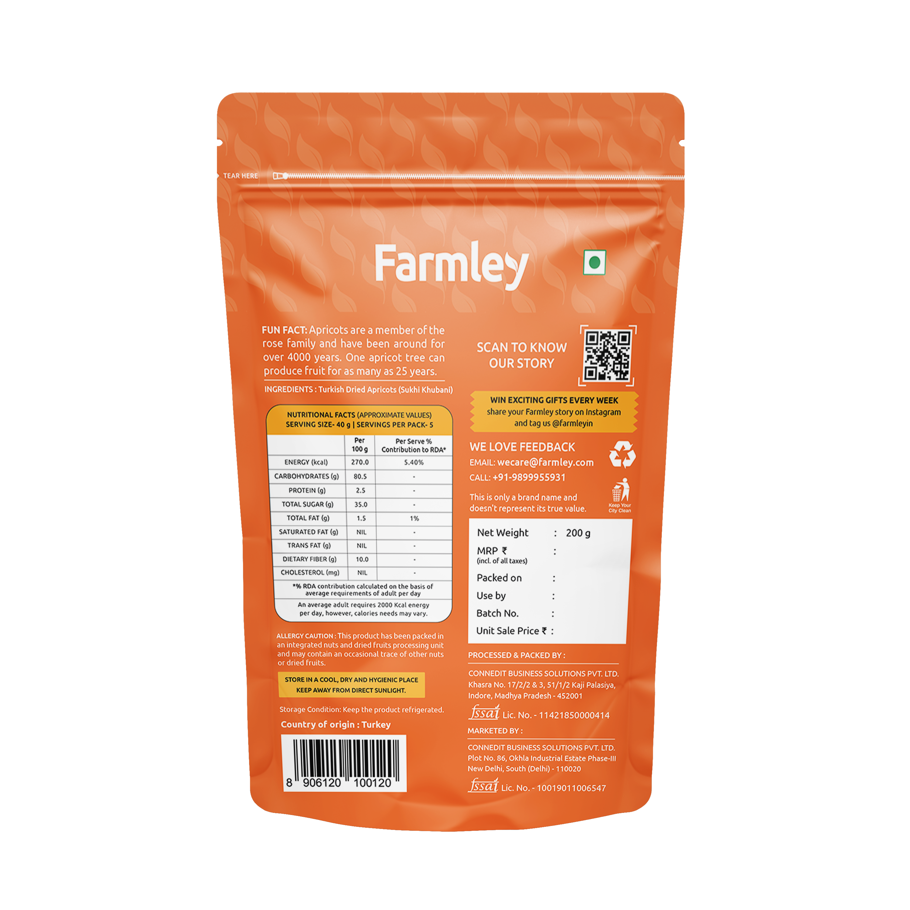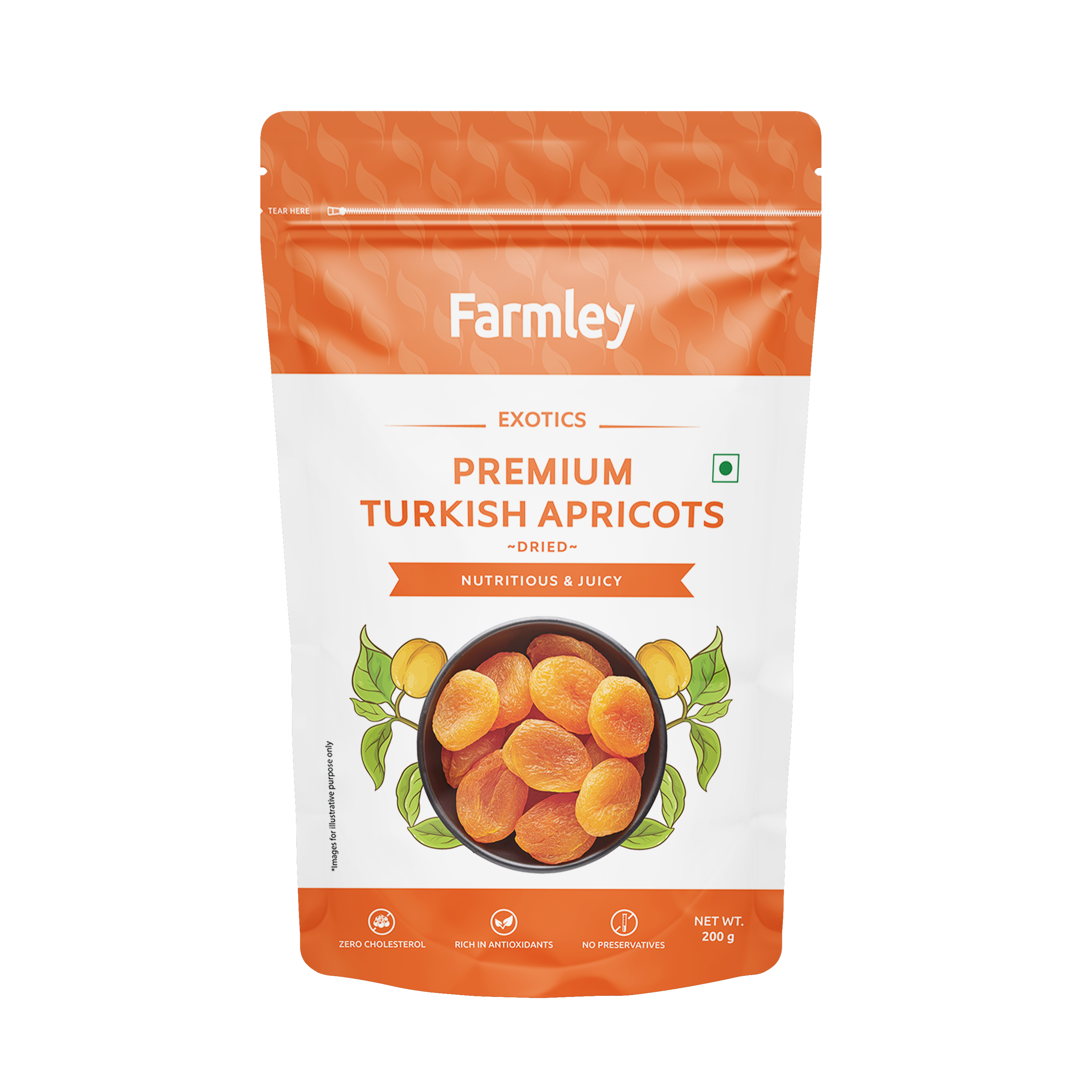 Promotes eye health, low in calories, rich in Vitamin A and C, high in antioxidants and provides a good source of soluble fiber, which feeds your healthy gut bacteria and may boost digestive health. Anytime guilt-free snacking: Snack on them at any time of the day or night when you feel hungry or low on energy. Resealable pouch for on-the-go nutrition. Bad quality apricots can be sulphur treated, wrinkled, hard to touch. Farmley brings the best quality apricots that are 100% naturally sourced, plump, shiny and free from additives and preservatives.