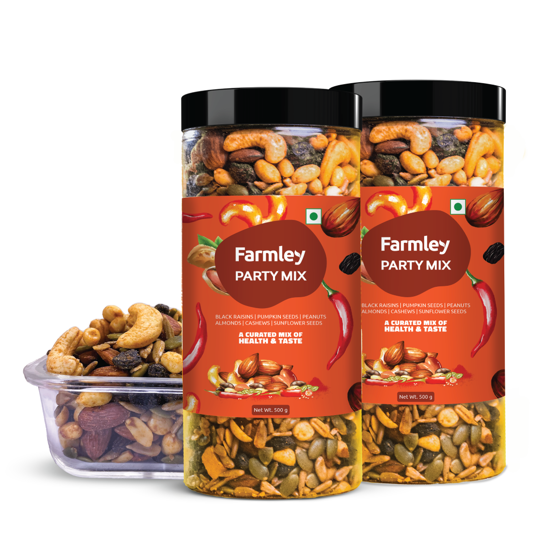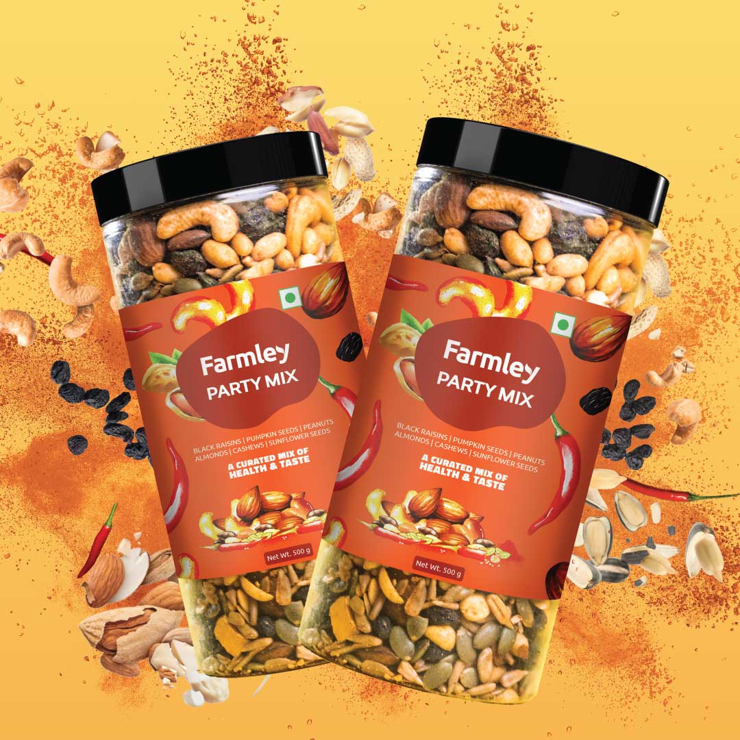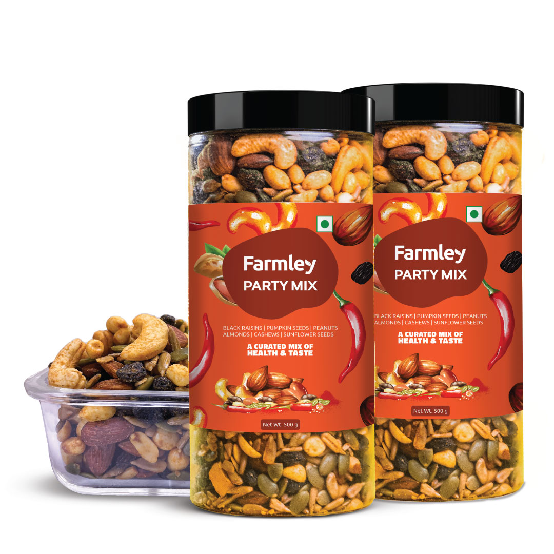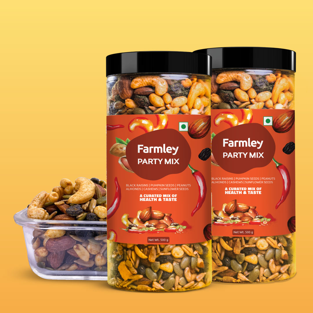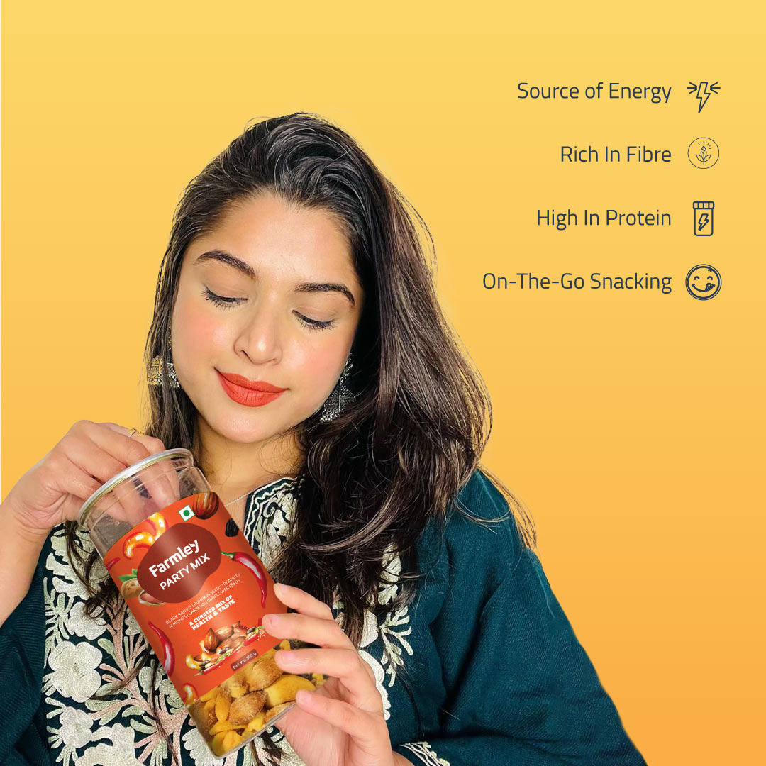 Farmley's Party Mix is sprinkled with a widely loved peri peri seasoning and carries 23% protein content. Roasted in olive oil, this go-to snack redefines guilt-free snacking. Crafted from Farmley's signature dry fruits and nuts, each handful is a perfect blend of health & taste. Packed with essential nutrients, Party Mix is a snack where flavour meets goodness. No more conscious party munching!