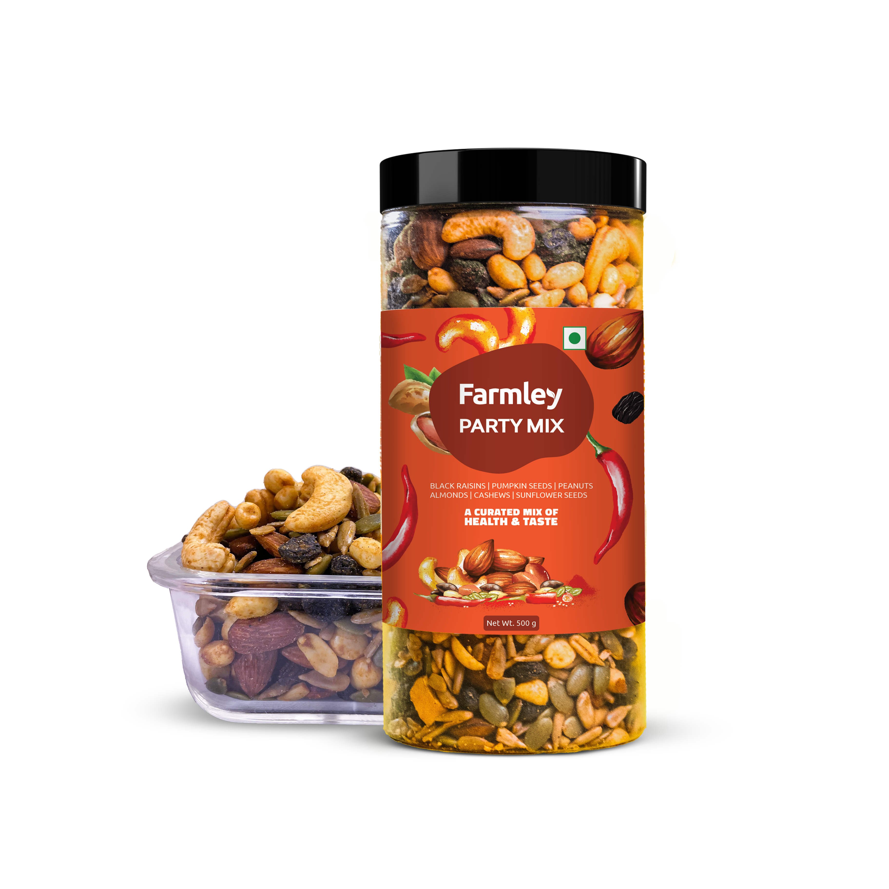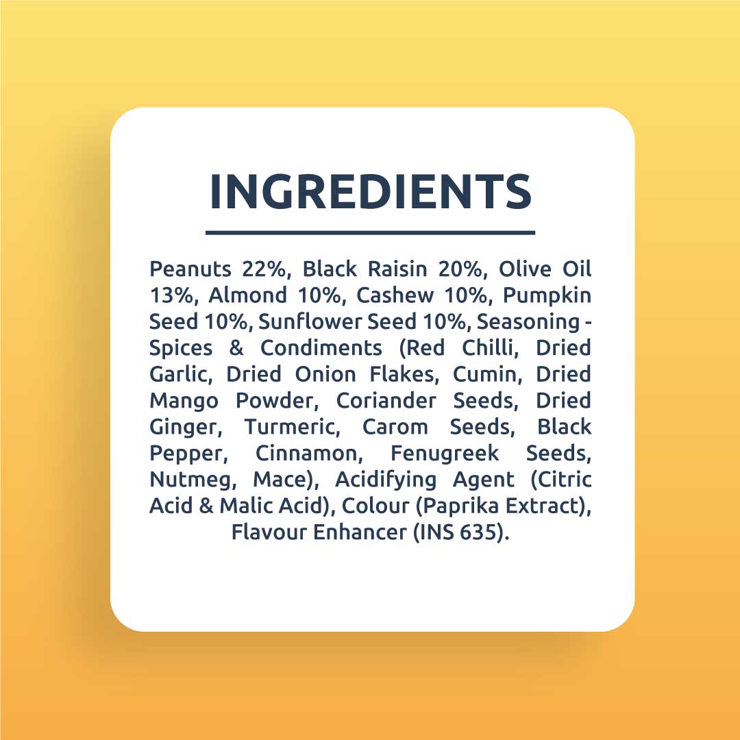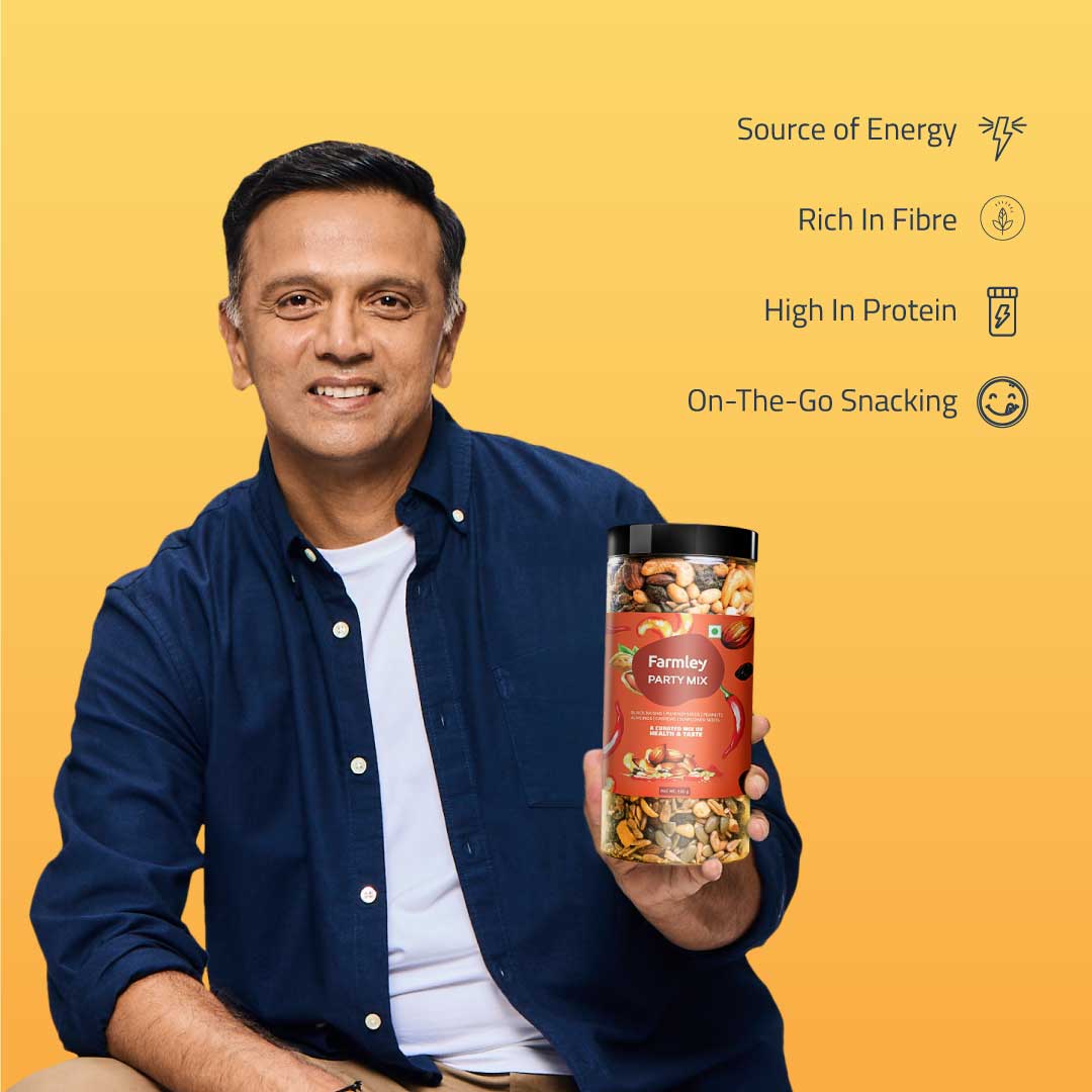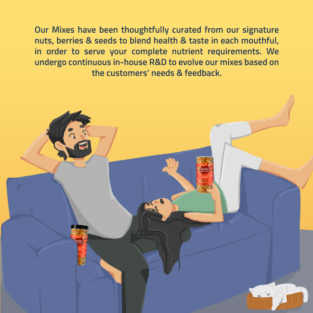 Farmley's Party Mix is sprinkled with a widely loved peri peri seasoning and carries 23% protein content. Roasted in olive oil, this go-to snack redefines guilt-free snacking. Crafted from Farmley's signature dry fruits and nuts, each handful is a perfect blend of health & taste. Packed with essential nutrients, Party Mix is a snack where flavour meets goodness. No more conscious party munching!