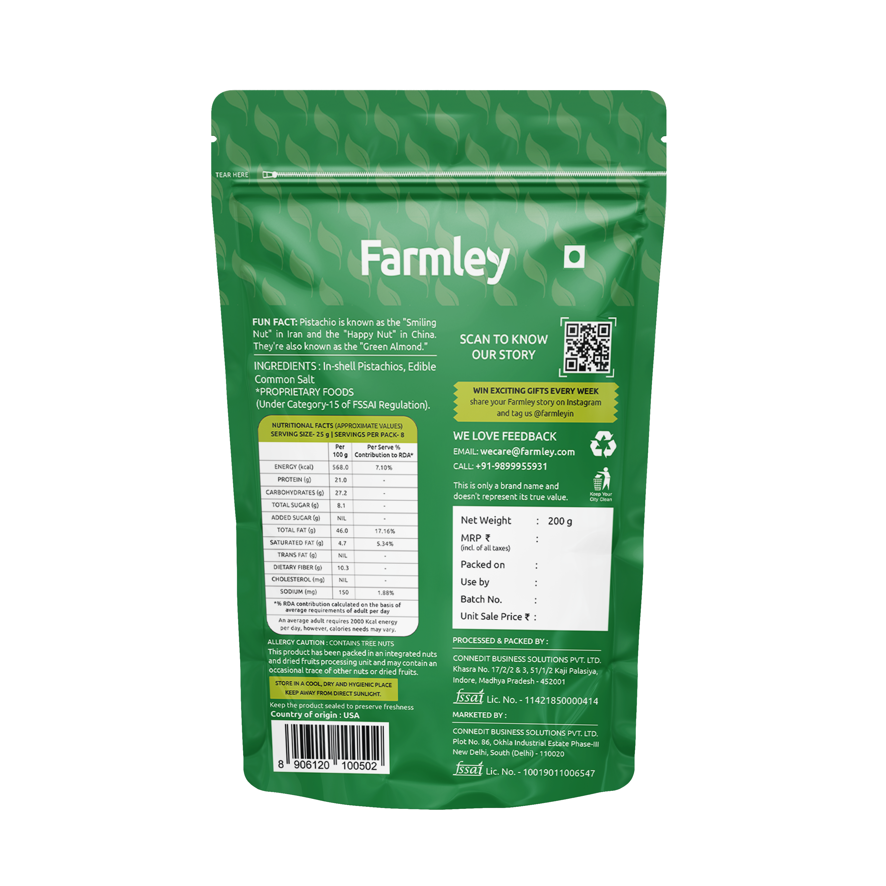 Direct from farm: Farmley sources all nuts and dry fruits directly from farms, ensuring hygienic packing in an HACCP certified unit.Why Farmley Pistachios: They pack handpicked pistachios that are 100% natural and free from any adulteration.
