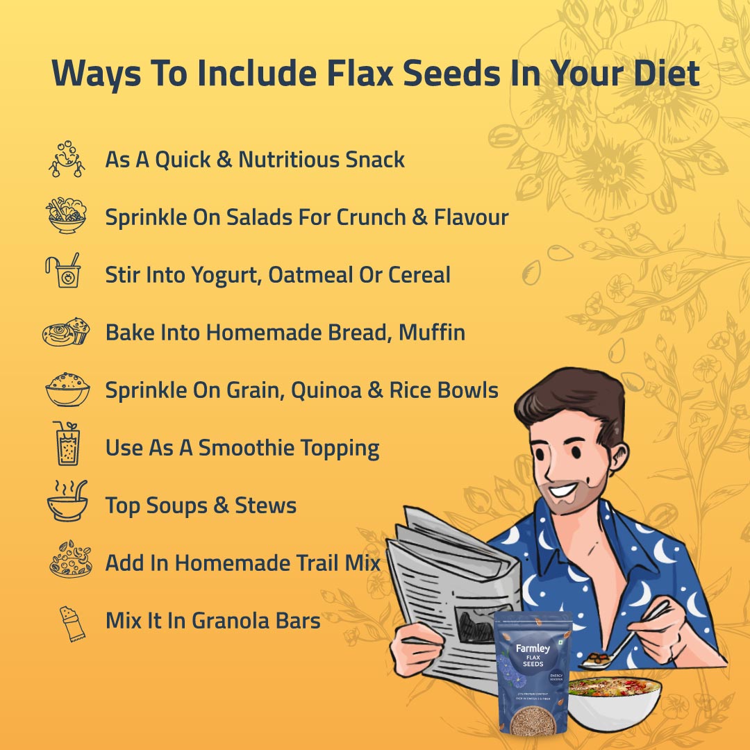 Source Of Protein: Protein is an important building block for bones, muscles, cartilage, and skin. Flaxseeds are a great source of high-quality, plant-based protein. One teaspoon of flax seeds contains nearly 2 grams of protein, and hence are a perfect alternative to animal protein sources. Adding them to a salad or smoothie can help boost your protein intake. Helps Lower Cancer Risk: In addition to the important omega-3 fatty acids, they are known to prevent the development of cancerous tumours. Flax seeds are rich in lignans (a group of bioactive compounds that are chock-full of antioxidant properties) that may protect the body from cancer by slowing the growth of existing tumours.