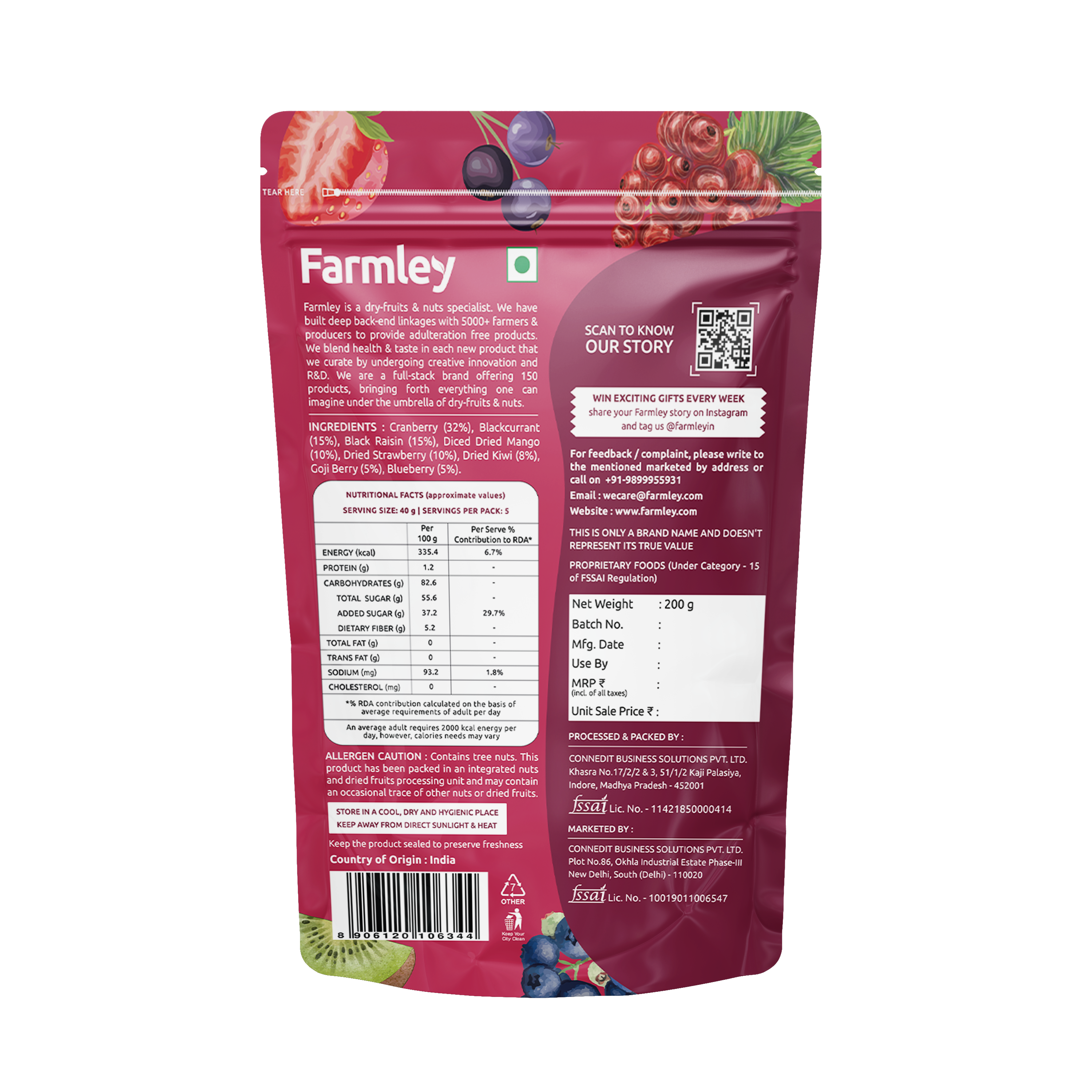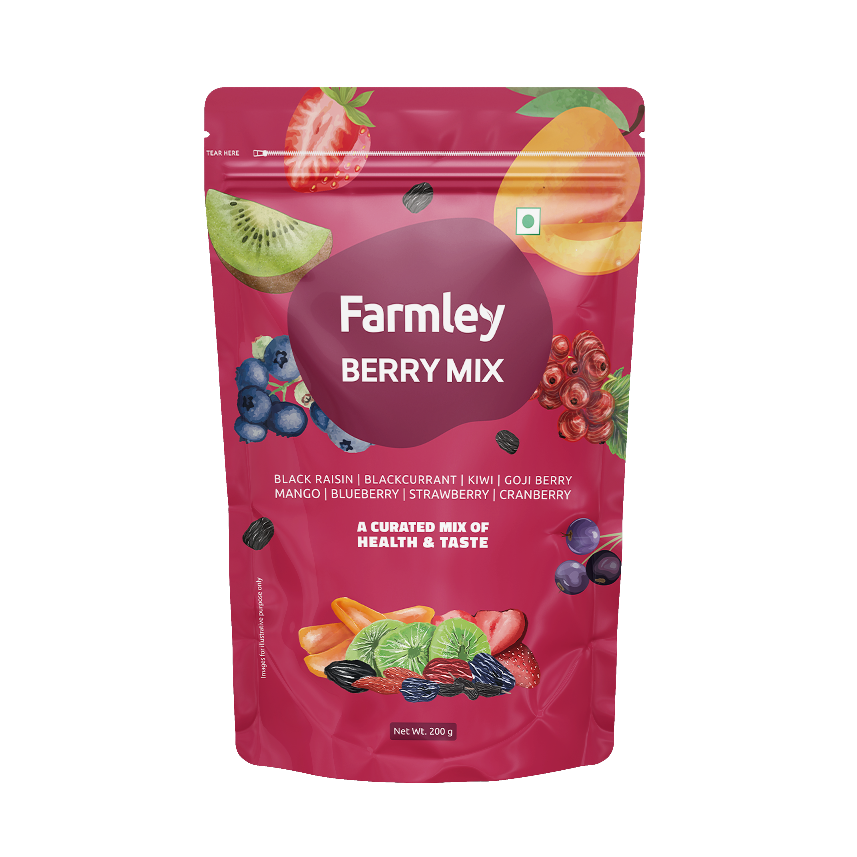 Farmley's Berry Mix is an appetizing fusion of 8 dried berries - Black Raisins, Blackcurrant, Kiwi, Goji Berry, Mango, Blueberry, Strawberry & Cranberry. Crafted for those on the move, this pure blend offers a burst of natural goodness without any additives or preservatives and is rich in vitamin C. Rich in antioxidants, it's a powerful energy booster that supports your well-being. With a refreshing taste, it's a delightful and nutritious choice for any occasion. Enjoy it straight from the pack, or get creative by adding it to cereals, salads, or baked goods. Sparkle up your snacking experience with this thoughtfully curated mix.