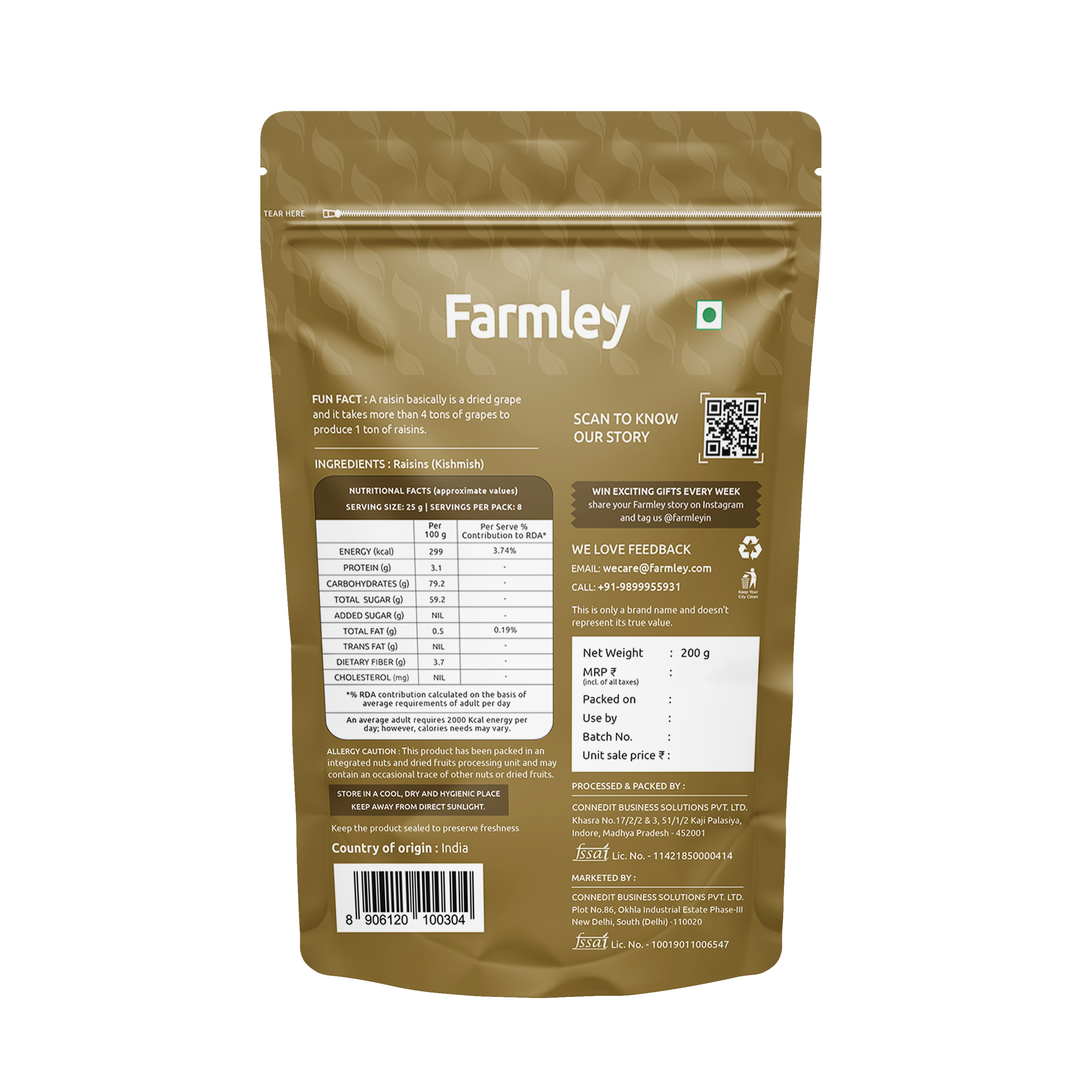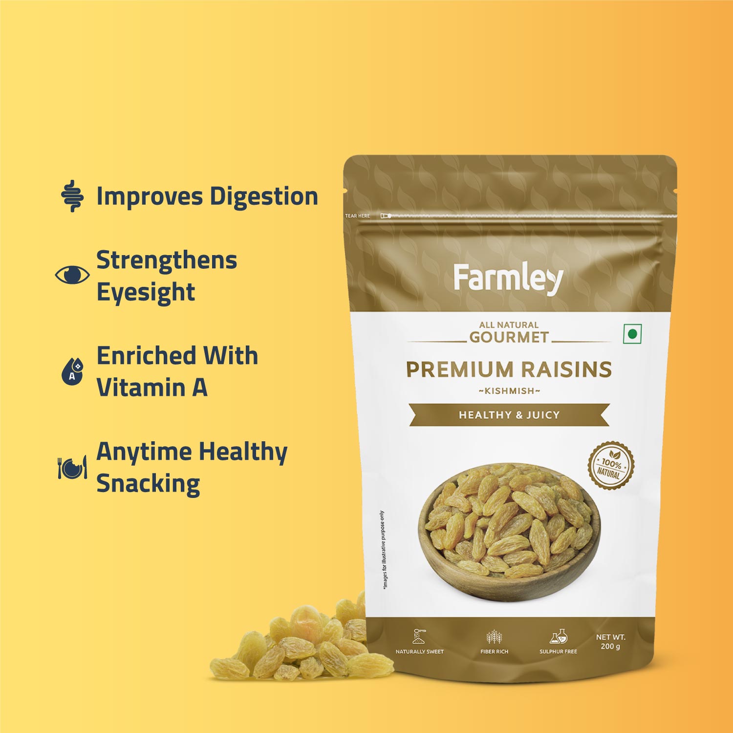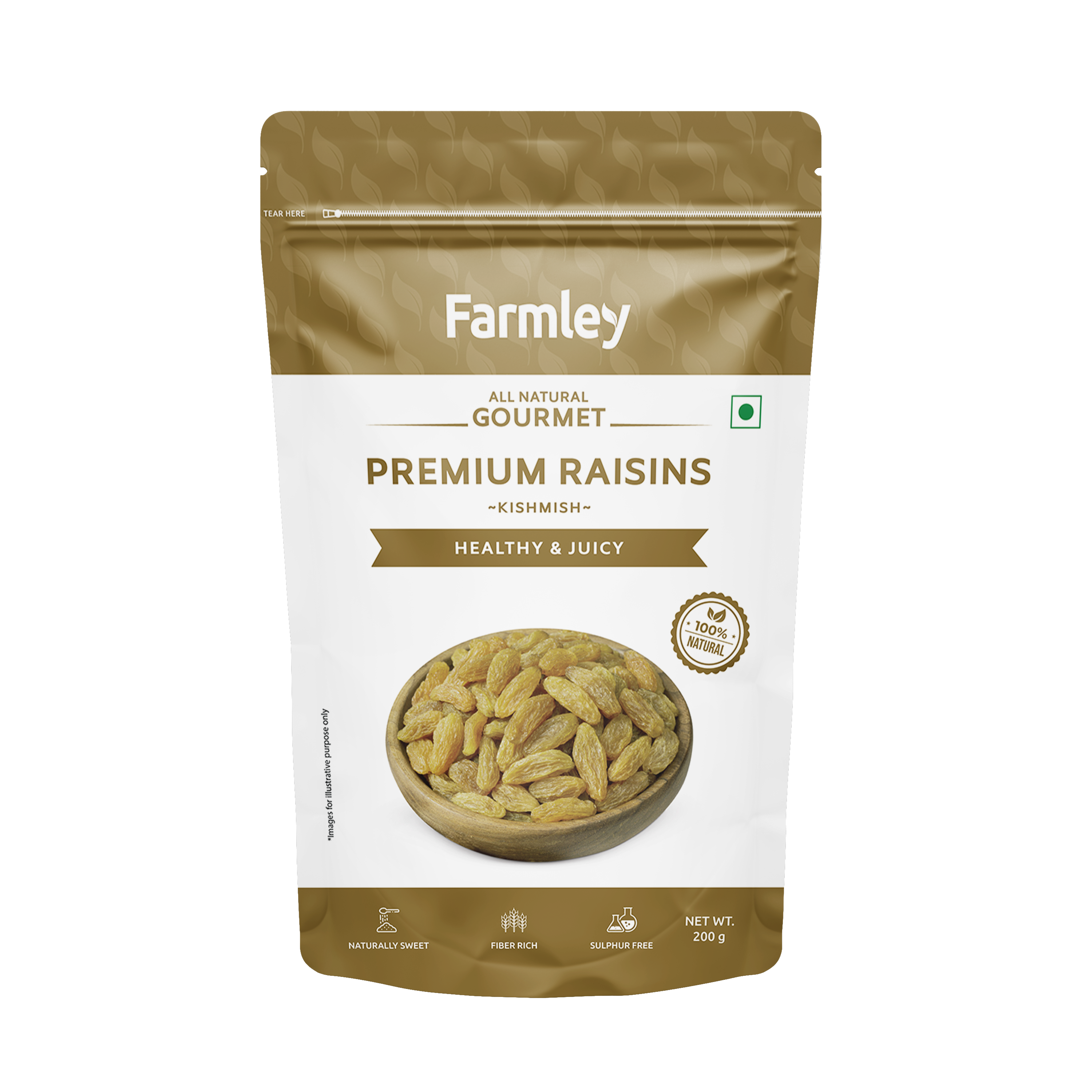 Direct from farm: Farmley takes pride in directly sourcing all nuts and dry fruits from farms, ensuring their hygienic packing in an HACCP certified unit.Why Farmley Raisins: Handpicked and 100% natural, Farmley's raisins are free from any adulteration.