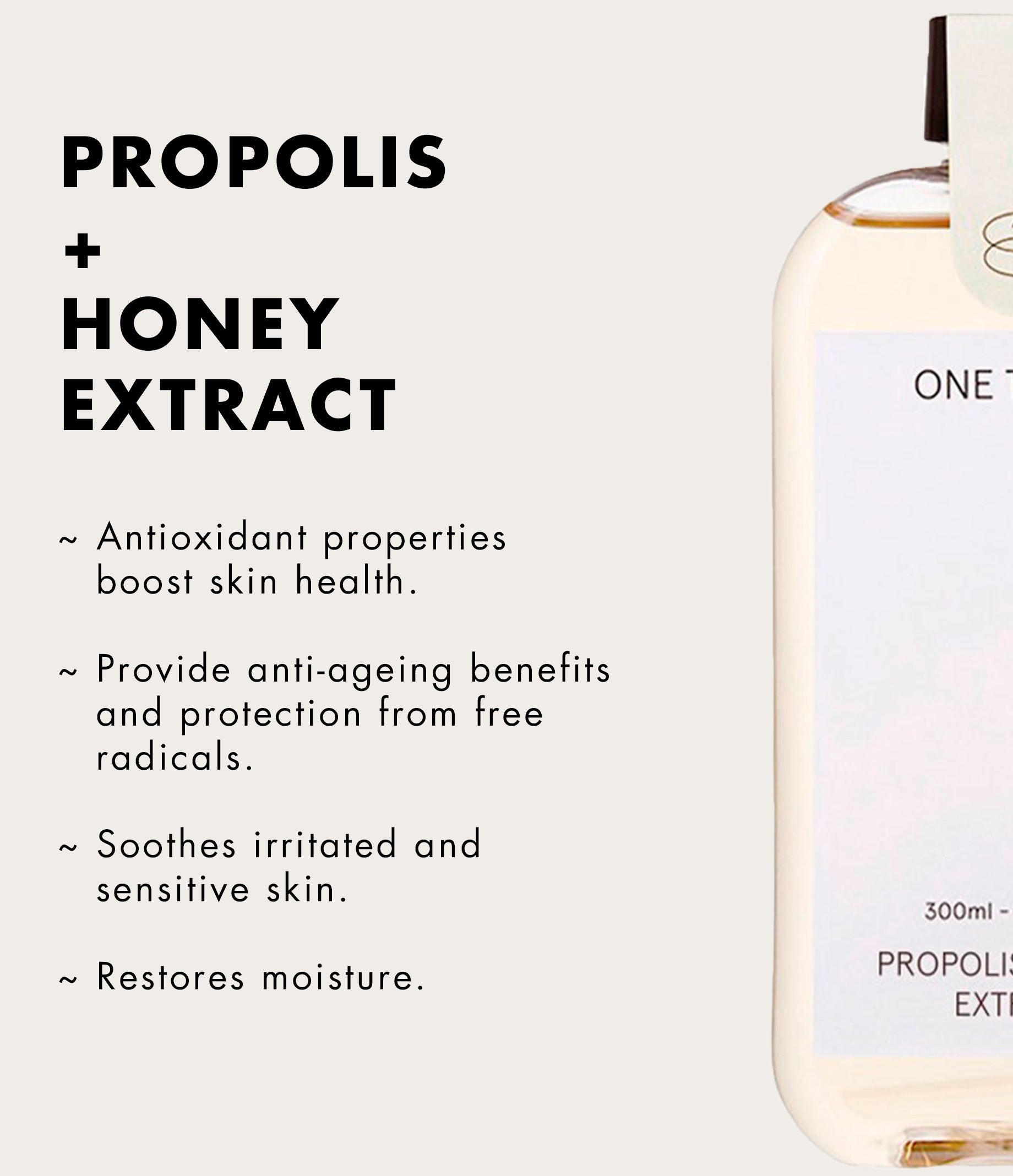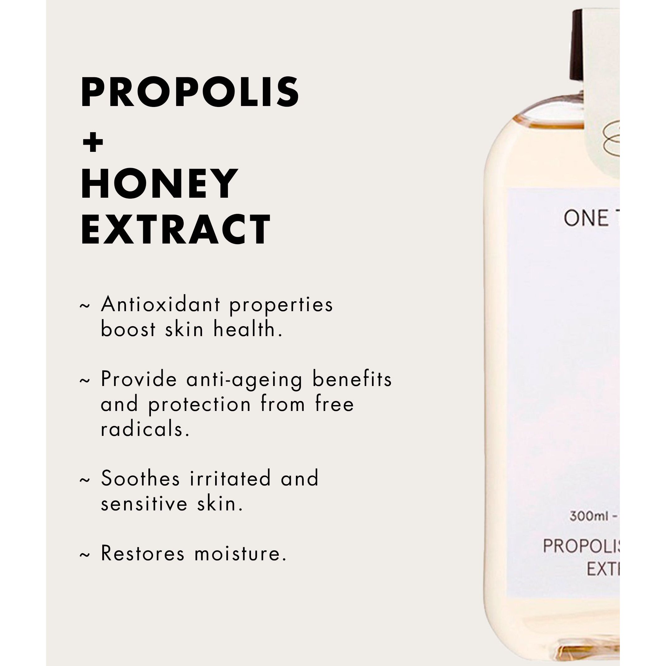 The one thing Propolis and Honey Extract is an ultra-nourishing toner that soothes and moisturizes skin, leaving it dewy and radiant. It uses only the Honey and Propolis extract collected locally on the unpolluted Jeju Island. It is extracted after long-term maturation at low temperatures and without alcohol, to preserve the potency of its benefits. The extract also contains hyaluronic acid to maximize moisture retention. Formulated with EWG verified green grade ingredients, suitable even for sensitive skin. Propolis and honey naturally help repair skin and protect it from free radical damage/oxidative stress. As antimicrobial and antibacterial ingredients, they speed up skin healing, provide care for acne breakouts, and soothe sensitive skin. They also brighten dull skin and add a burst of hydration. The formulation allows the extract to be used in multiple ways - either on its own or even mixed in with other products. You can boost your regular skincare routine by adding other ONE THING extracts for added benefits.