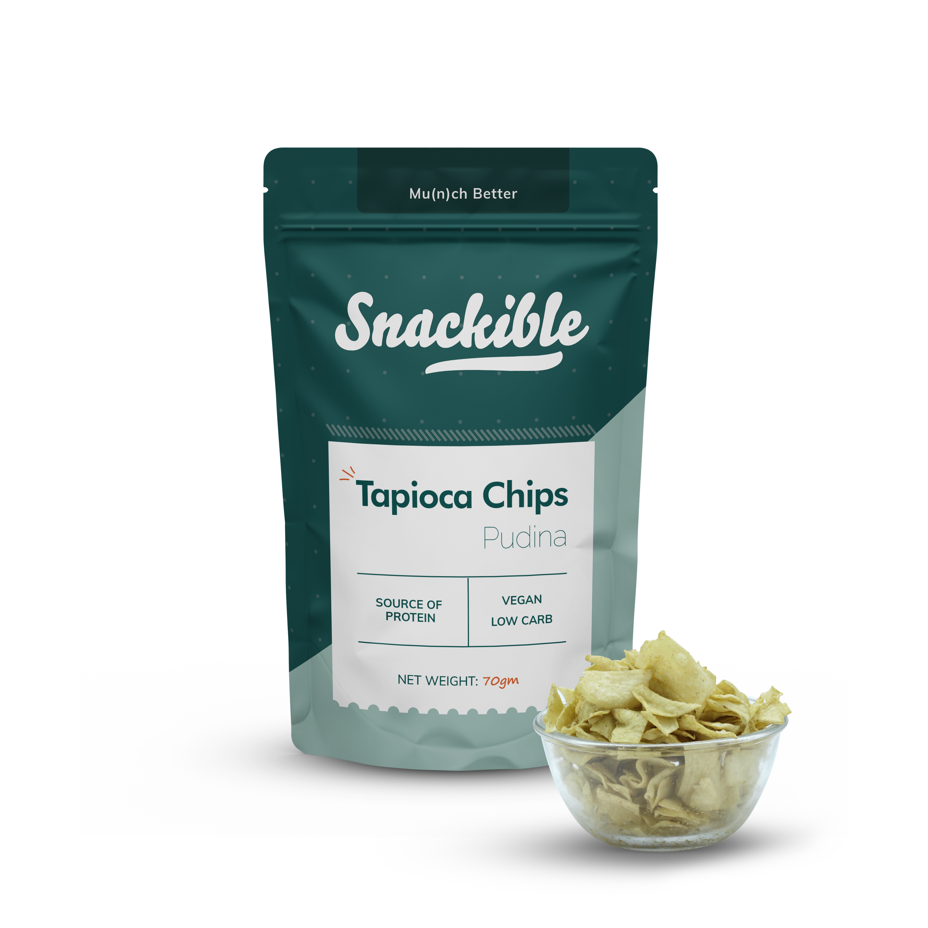 Gluten free crispy snack made with the goodness of Tapioca. Tapioca is a starch extracted from cassava plant and is a staple food for millions in tropical countries. Our chips are good source of protein and is perfect as low sugar snack, and of course, we've spruced things up by dousing it in pudina flavouring.